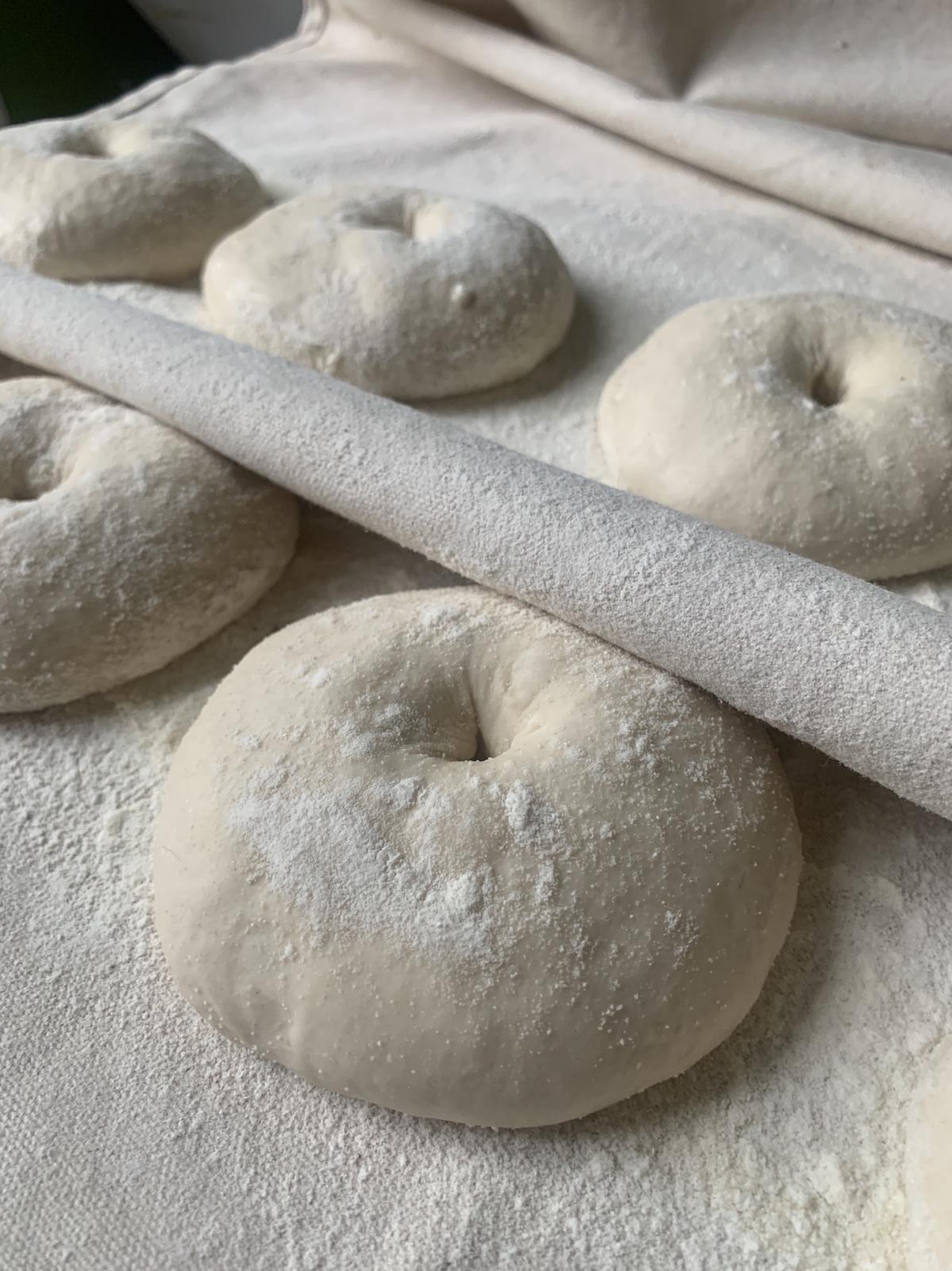 I mixed (30min), added salt (30min), 4 folds (2rs), bulk proofed for 4 hours, divided and shaped (each bagel had a wild range of 150-190g), dusted them generously with bread flour, put a baking sheet to cover them, and then cold proofed overnight (5 hours).