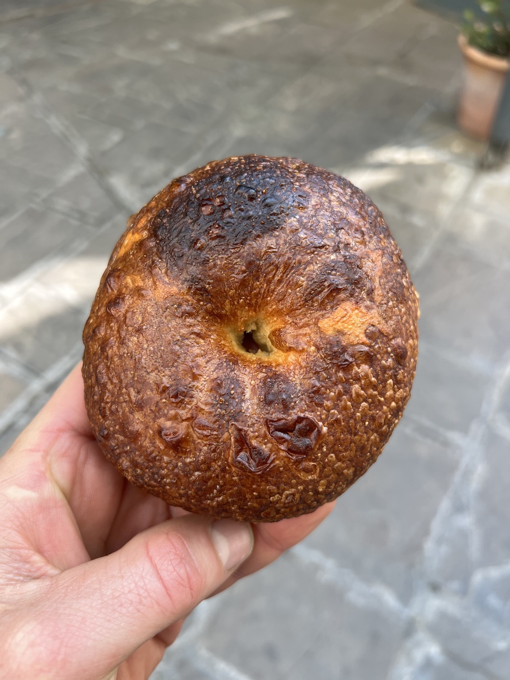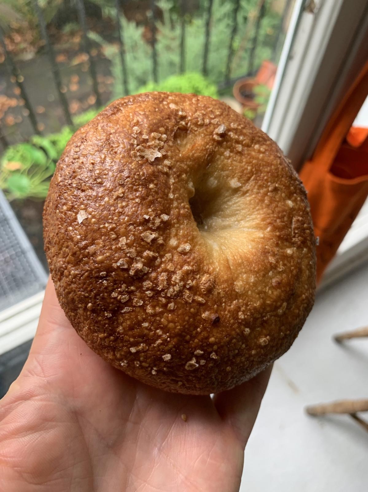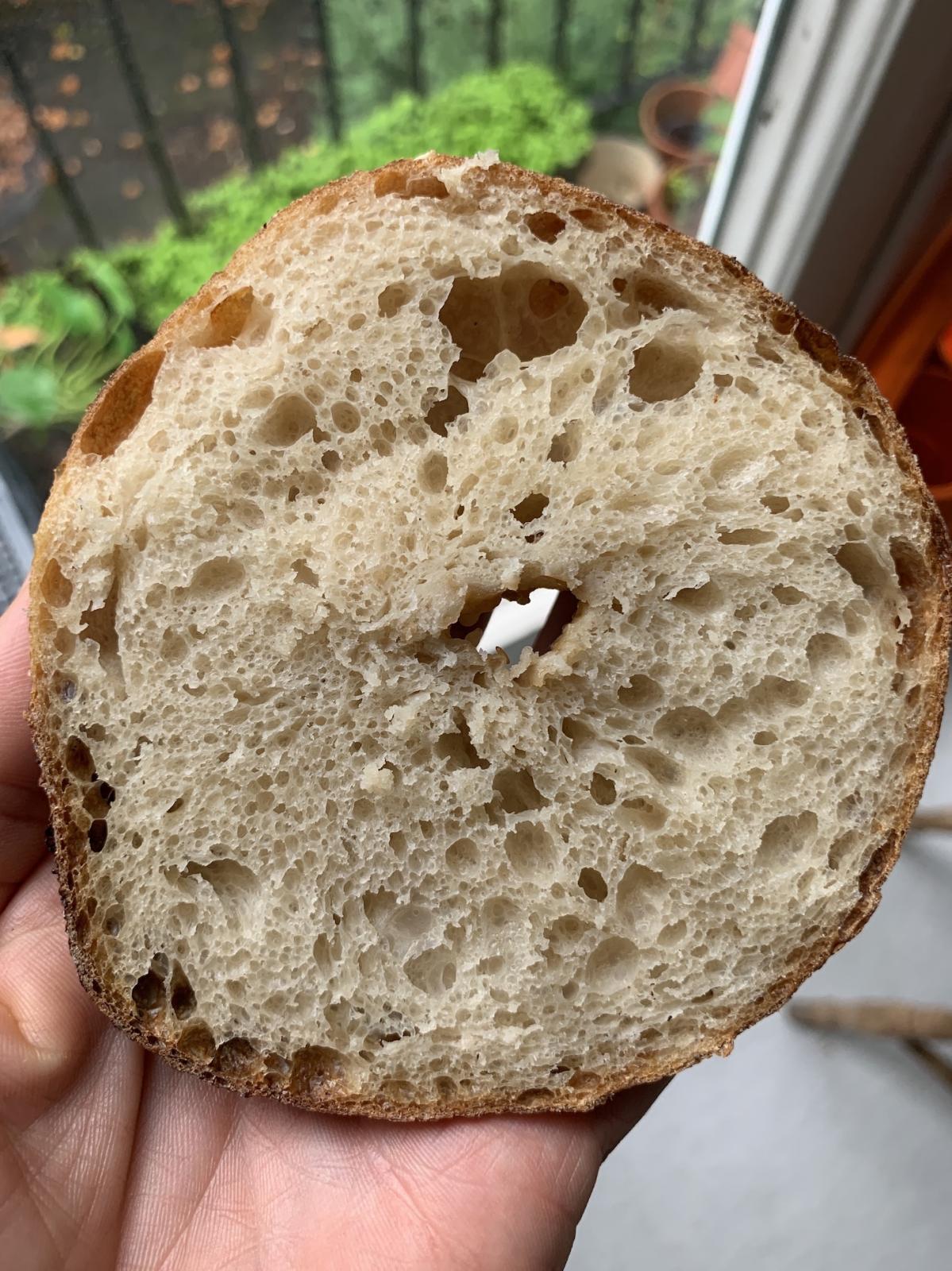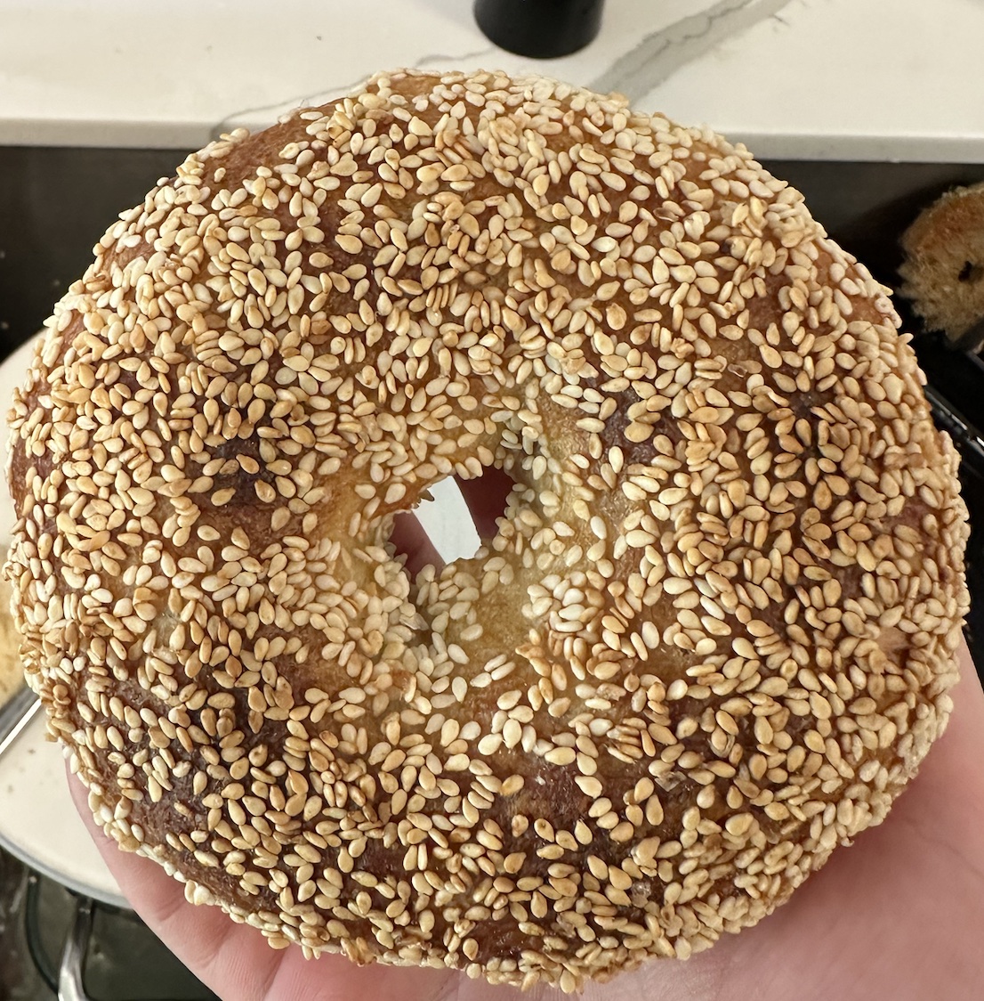 The good: an easy way to shape and boil. May change the way I normally make bagels. Who would have thought open crumb bagels were possible! Very light feel in the hand compared to my usual bagels.