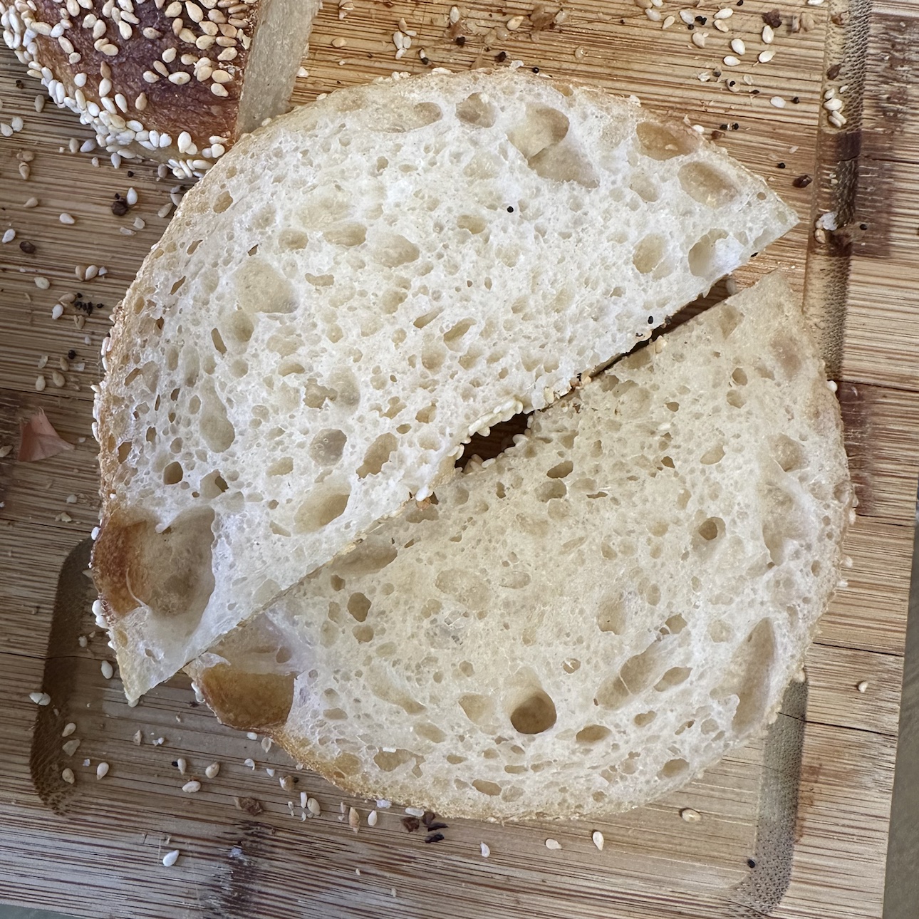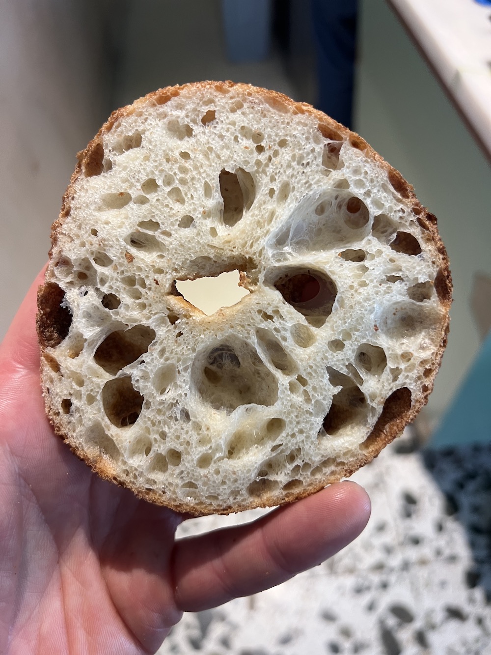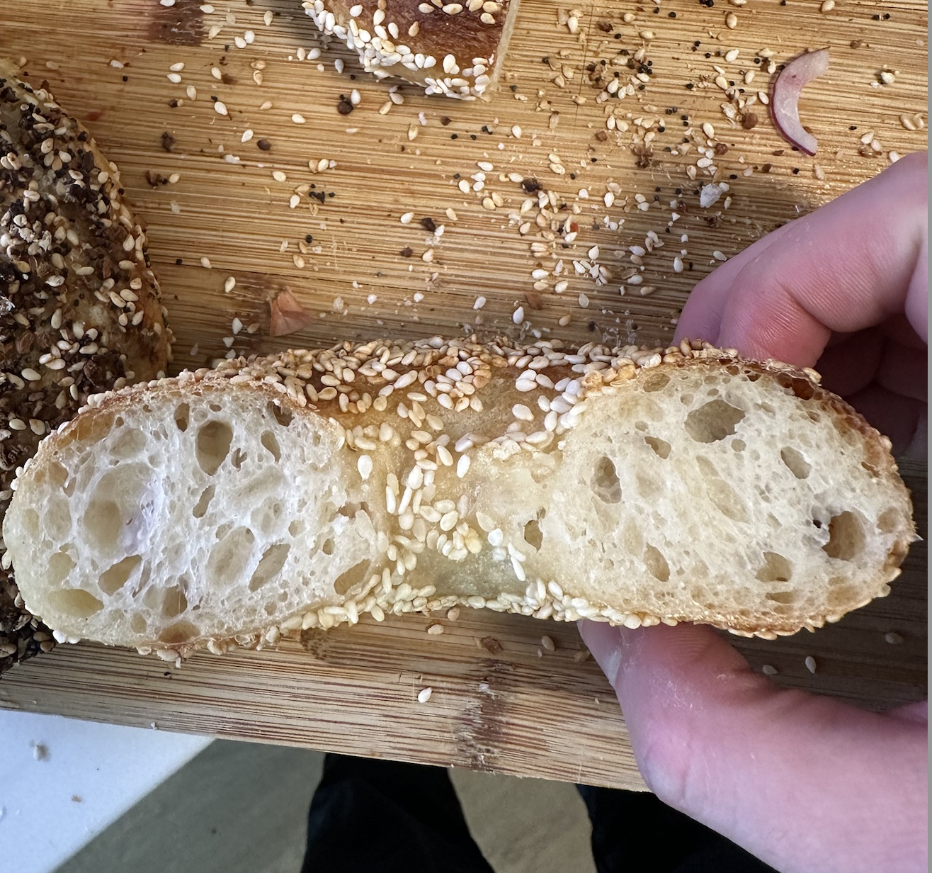 Also, the bagel with the super open crumb from their pizza restaurant instagram is NOT the norm for them, hence the photo. If you look at most of their other photos, especially their bagel sandos, where the bagels are cross- cut, you can see that their bagels have a crumb resembling that of your 77% hydration bagel, rather than that of a  Perrando style bread. I believe that particular photo is throwing you off of the scent. But either way youre on track.