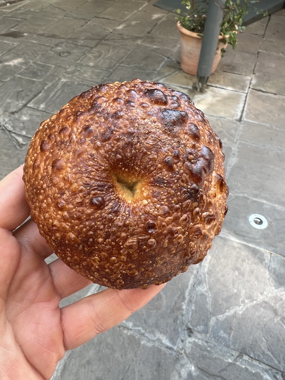 or in their case the lack of shape and tension. my observation is that these dough portions had minimal preshape and tension (unlike a portion of pizza dough ball) and were more just delicate pillowy blobs like foccacia dough. then doused in flour, a hole pinched in the middle and delicately opened, then dropped in the kettle.