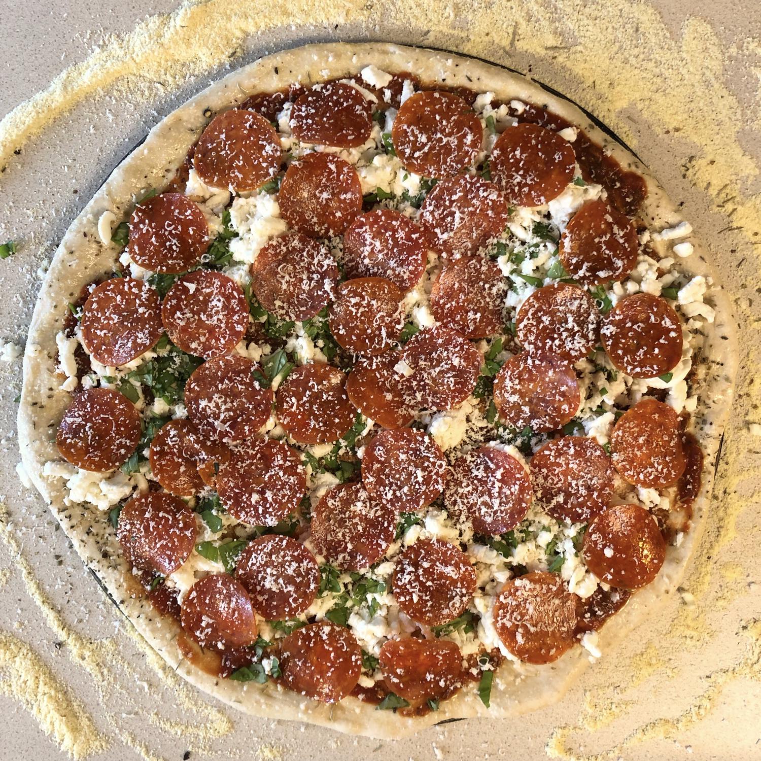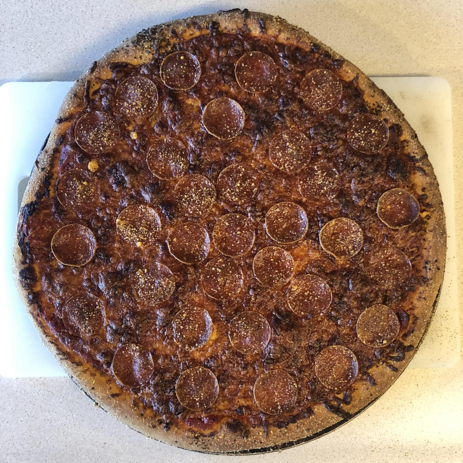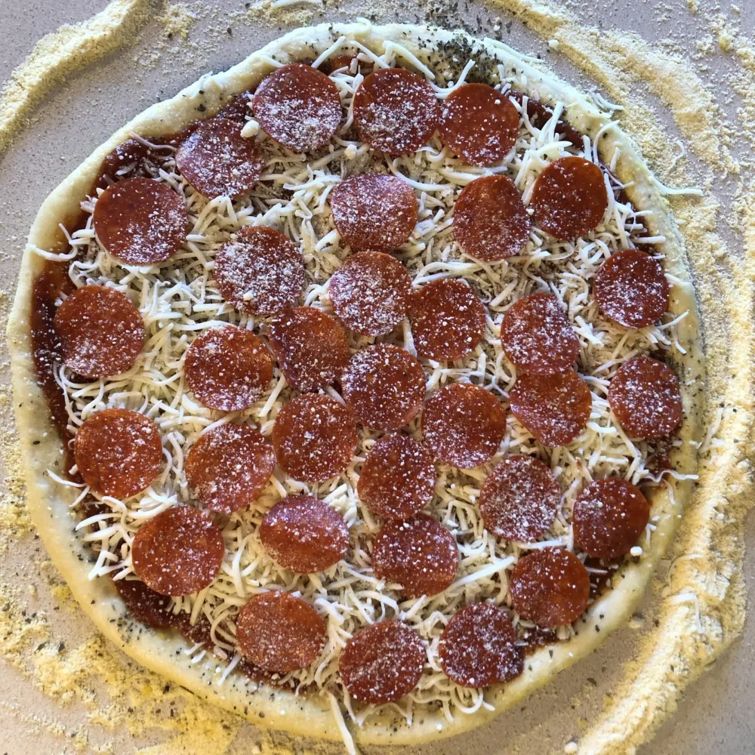 Toppings - pepperoni, dried whole milk mozzarella, pizza sauce, salt, pepper, oregano, basil and EVOO brushed on the crust.