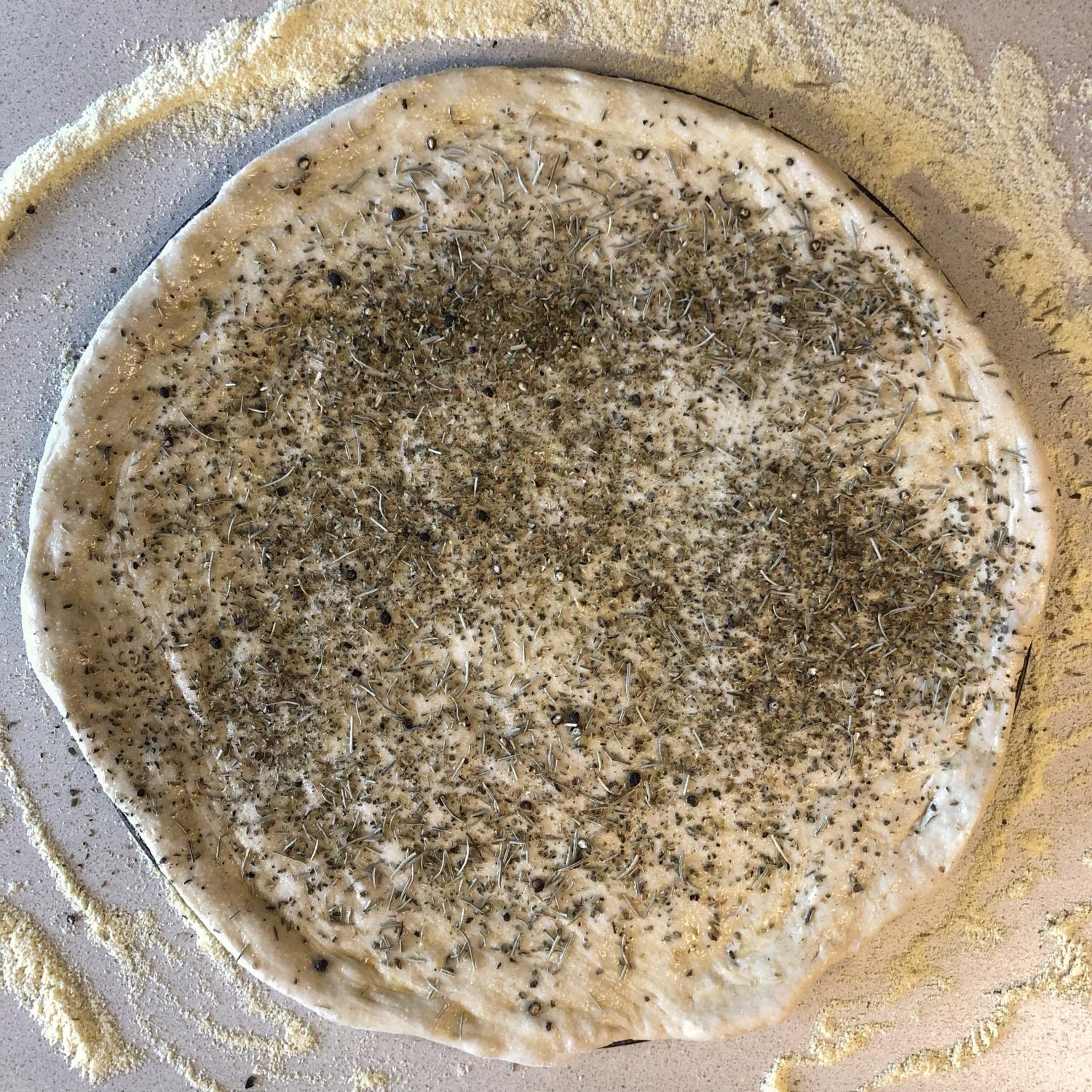 Seasonings include fresh basil (featured ingredient), rosemary, thyme, oregano, salt, pepper and EVOO brushed on the crust. Fresh mozz, pepperoni and freshly grated parmesan.