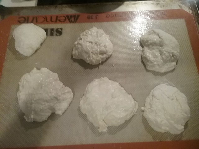 Mix all and let sit until doubled, then put in the refrigerator overnight (8+ hours). I attempted one stretch and fold (or bucket fold, it was just soup) before putting it in the refrigerator. About 24 hours later I pulled it out and dusted the top with flour and poured the blob out of the container onto a heavily floured surface. I tried handling it with wet fingers, but that didn't work so I floured the top and that worked better. I was able to get it into a loose oval shape after a few stretch and folds. It jiggled, like Jello. I let it rest for 10 minutes and tried to do another fold, but I gave up and just cut the darn thing with my dough scraper and plopped the sticky masses onto the pan. It's in the oven.