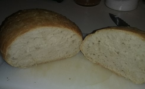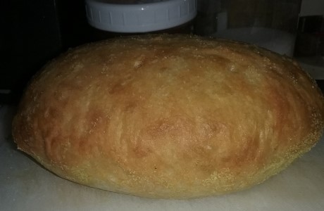 Preheated oven for 425F. Stretched the dough out a bit and did some finger poking all over it instead of scoring. Baked for 20 minutes. Took it out and rubbed a butter stick on the top. Put back in for 5 more minutes. Bread temperature read 205F.