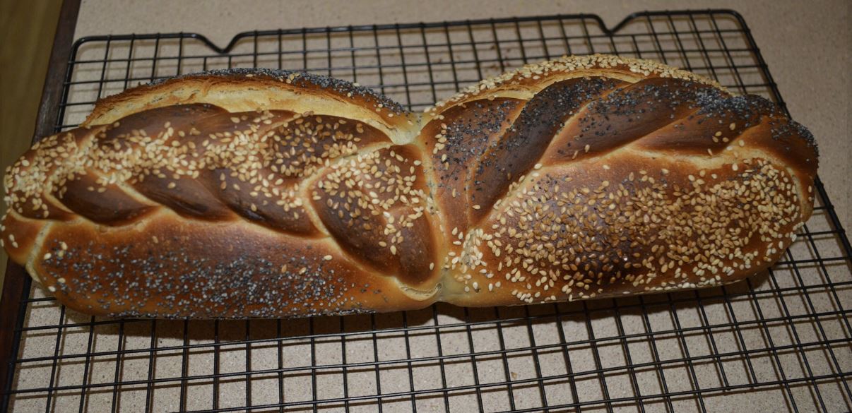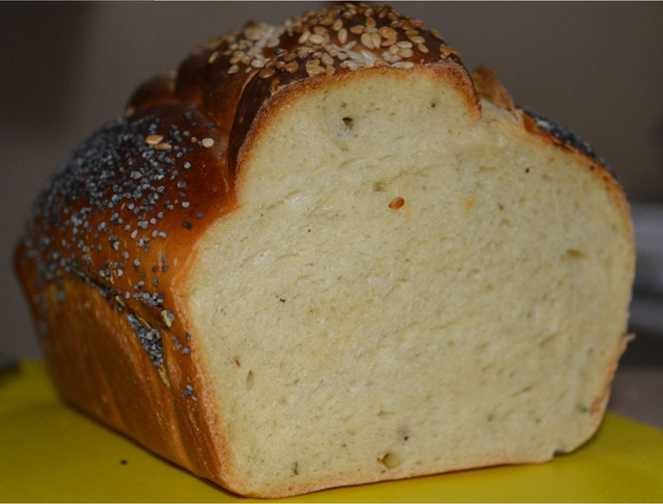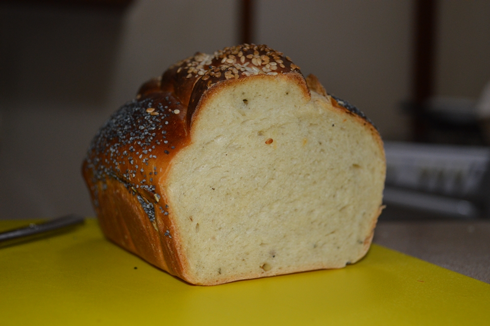 Wow Derek, that is one fancy looking loaf. I love the crumb it has a nice yellow hue I would have guess that it had eggs in it, but I don’t see that in the ingredients. The lovely braided decoration and seeds make the outside look so inviting.