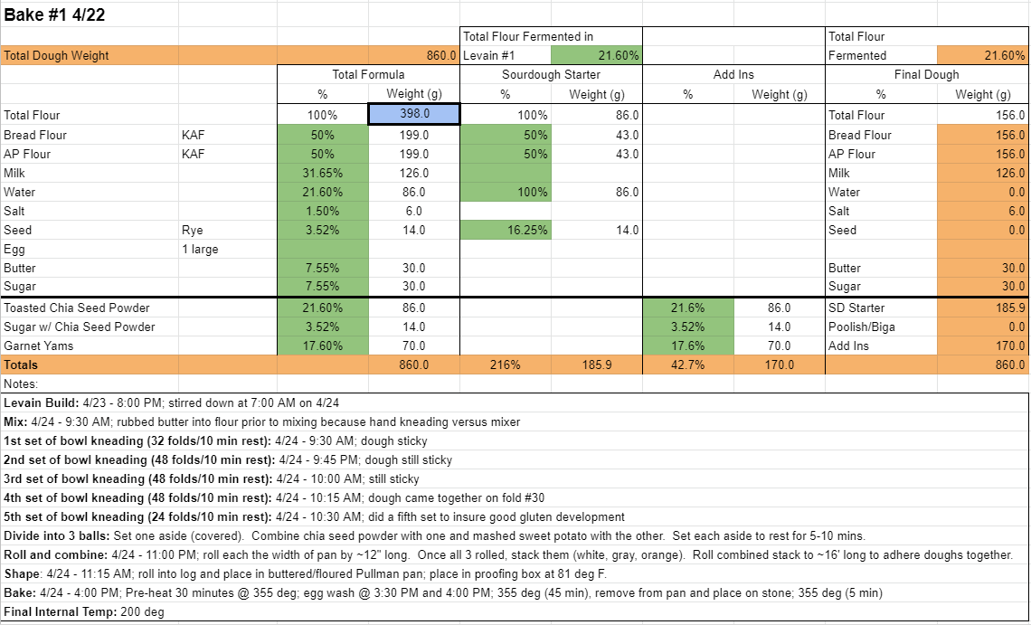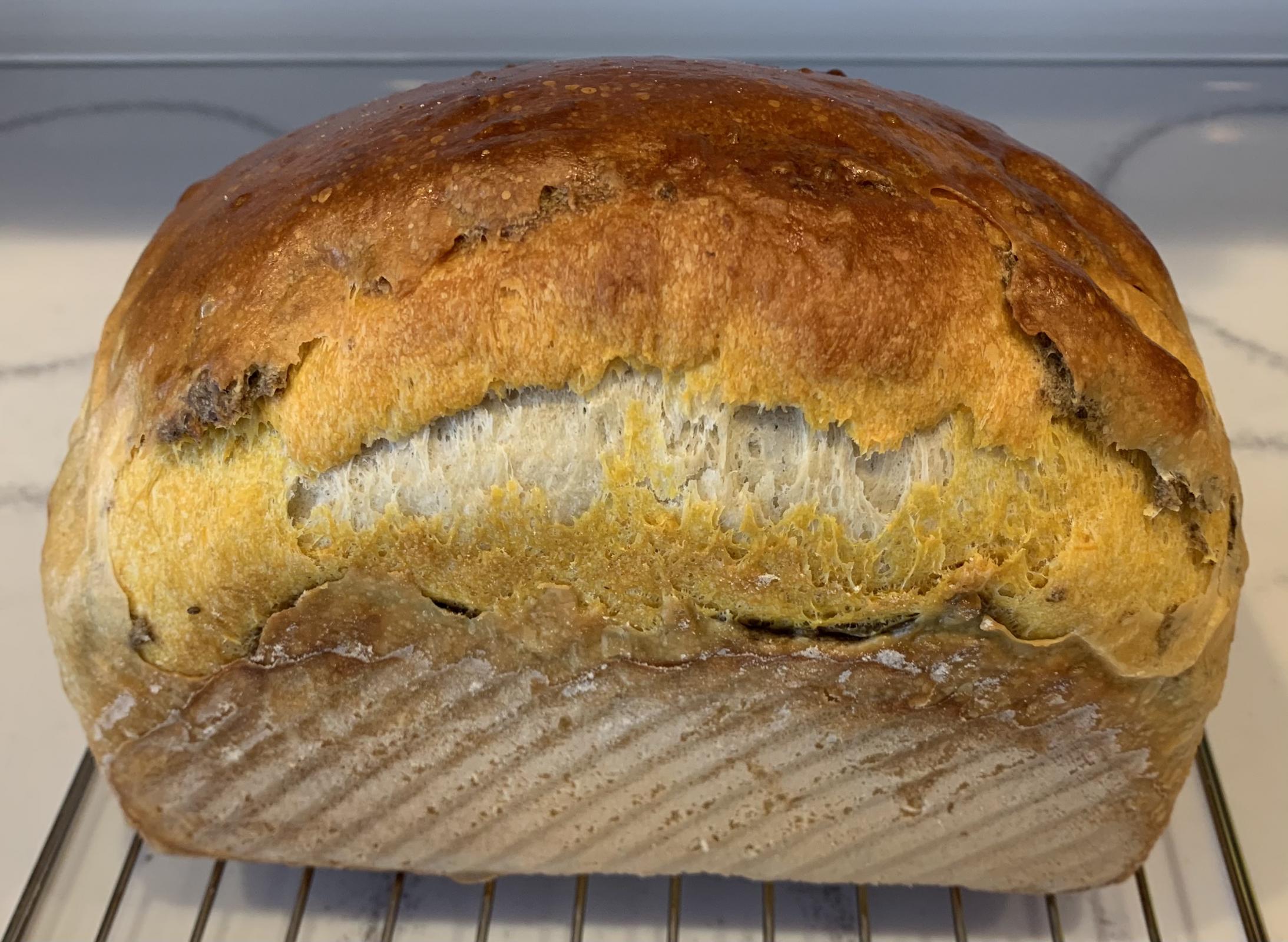 Well done Troy, better than my first attempt. I’m sure if you decide to make this again the next one will be perfect. As you’ve already said to me, it could have proofed longer and then you would have avoided the very small blow out which in reality doesn’t take away from your beautiful loaf. The garnet sweet potato colour is lovely as is the chia seeds. You did well rolling with it and dealing with the hydration challenge of the chia seeds so your baker’s intuition is working well!!