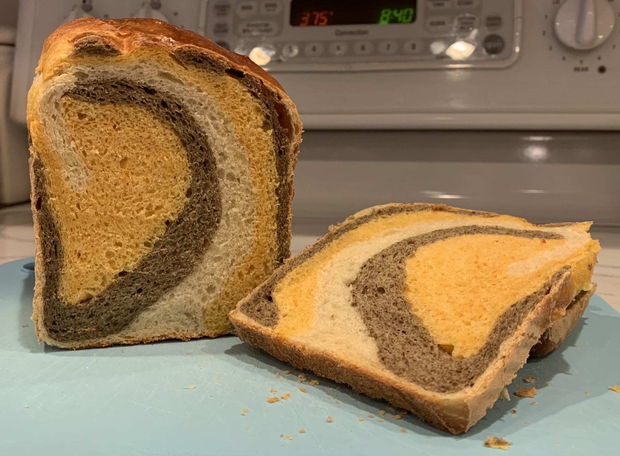 The list of bakes from other TFL'ers I want to do keeps piling up, so I decided to start trying a few of them. First up on the list was Benny's swirl milk bread. Didn't execute it as well as the master, but didn't come out too bad for the first attempt. :-) Followed the method exactly as outlined in the post link below. Only change... I did not have black sesame seeds, so opted for black chia seeds. I couldn't find a purple sweet potato, but I found a Garnet yam, and the color from the yam held nicely.