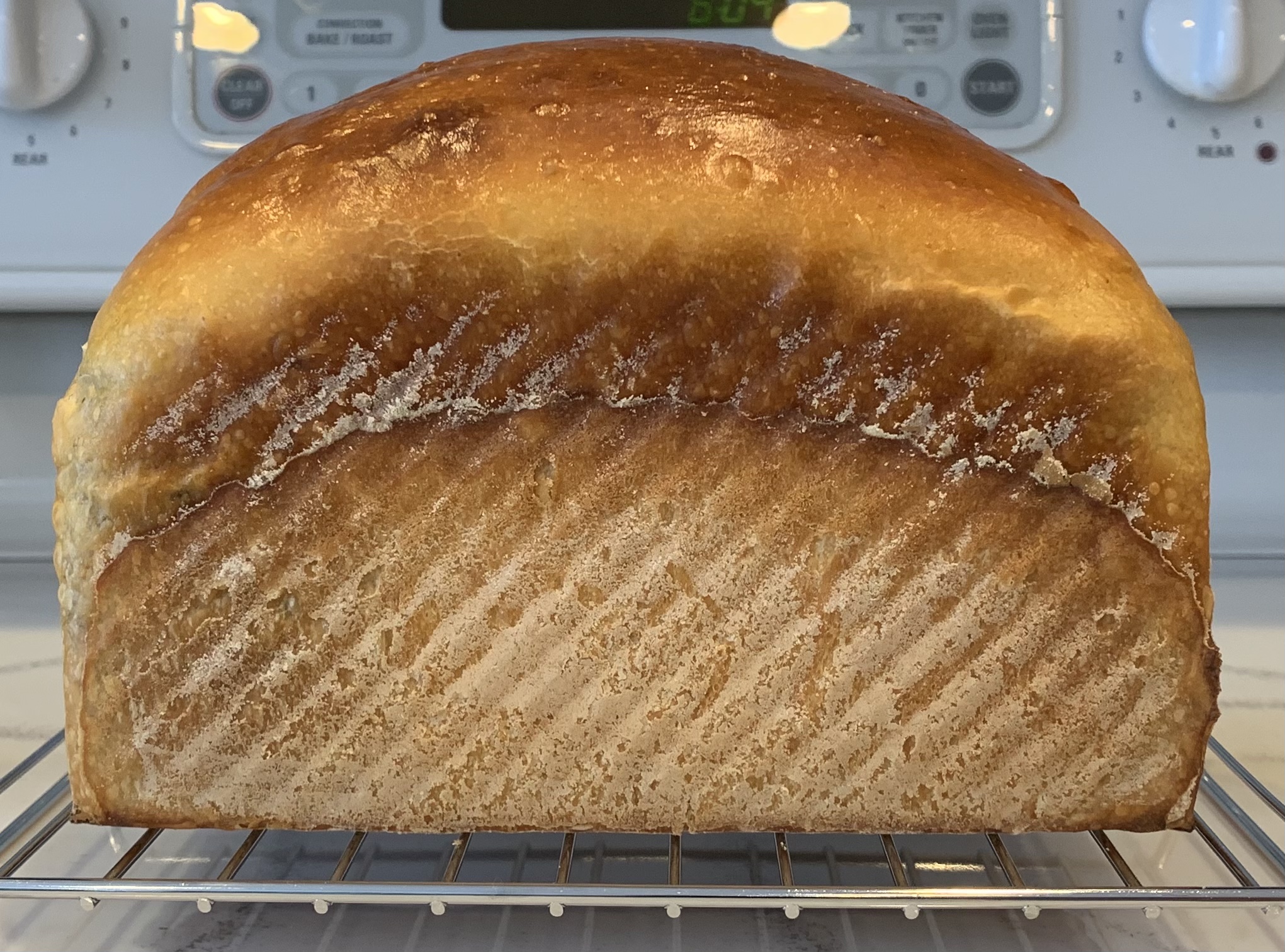The flavor of the bread is very good. The chia seed is there, but kind of mild. That’s probably because I could only get 1/3-1/2 of the 86g into the dough.