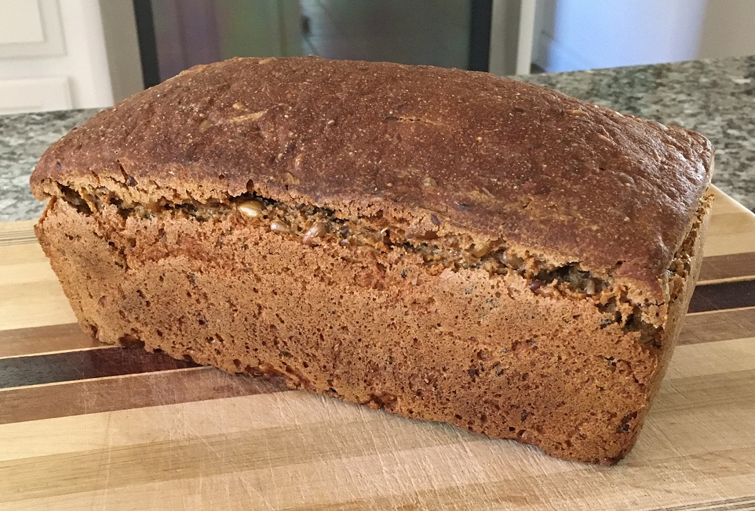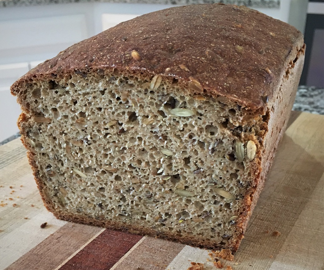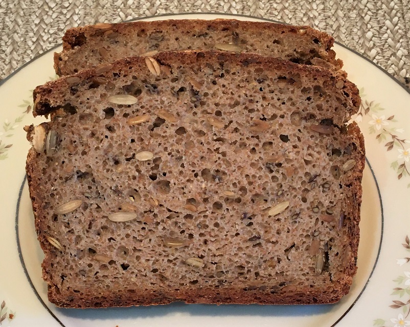 The bread has a crisp crust and is easily sliced.  The crumb is moist but not gummy.  The seeds provide a nice addition to the flavor of the three different flours.