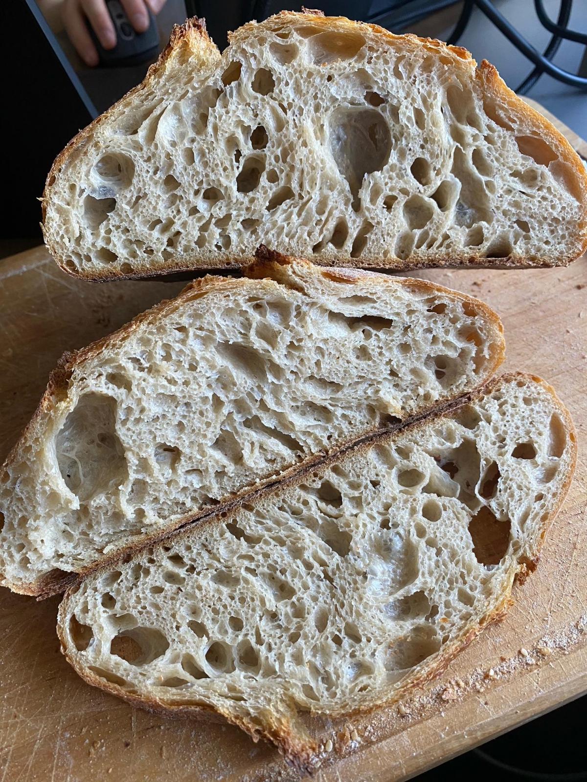 Super nice bread in all respects. The crumb has very thin cell walls and is lacy. A highly prized attribute!