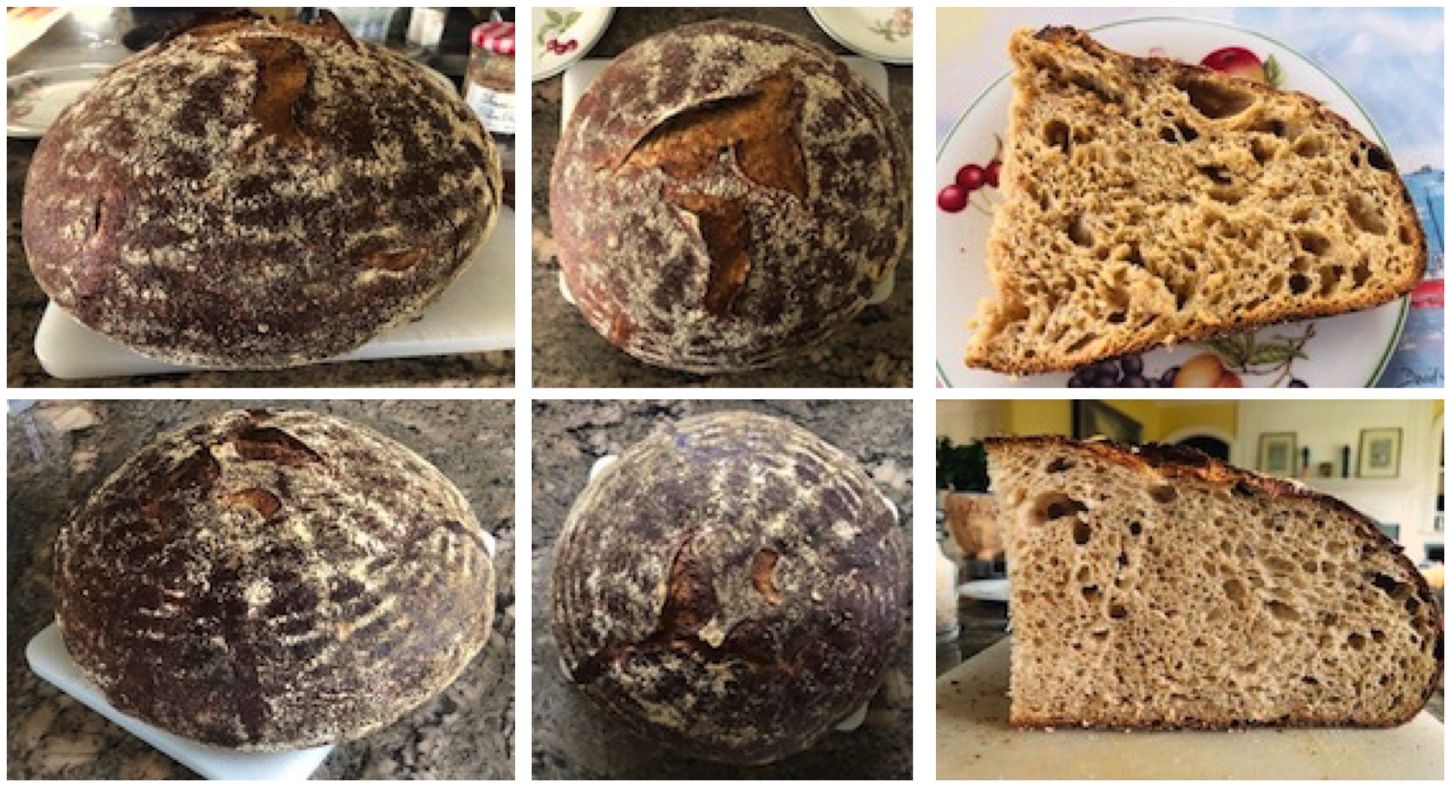 These loaves' flavor was normal/excellent for our weekly 60% fresh milled whole wheat miche. If I use my imagination, they are less sour, but perhaps only because I expect the added yeast to have competed with the flavor- and acid-producing bacteria. Sourness normally builds over days but hasn't seemed as pronounced in these breads, which suits us fine.