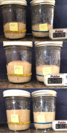 Overnight Raisin Yeast Water was pre-tested as a SD inoculum diluent by inoculating some with leftover starter and flour. A water diluent control was included (an ORYW + flour control [i.e., minus starter] was unfortunately omitted). The ORYW treatment ("RW" in the three time points shown) expanded faster and ended higher than the control. This wasn't replicated or precisely quantitative (I now have Fermentation Tube envy, Benny), but confirmed that the ORYW doesn't negatively impede starter performance in terms of expansion (CO2 production).