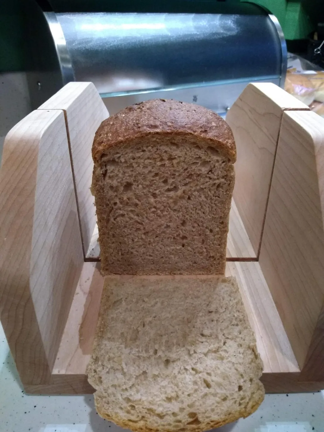 Great looking bread! Nice slicing contraption, too. Both guides the knife and catches the crumbs! Looks like it's maple.