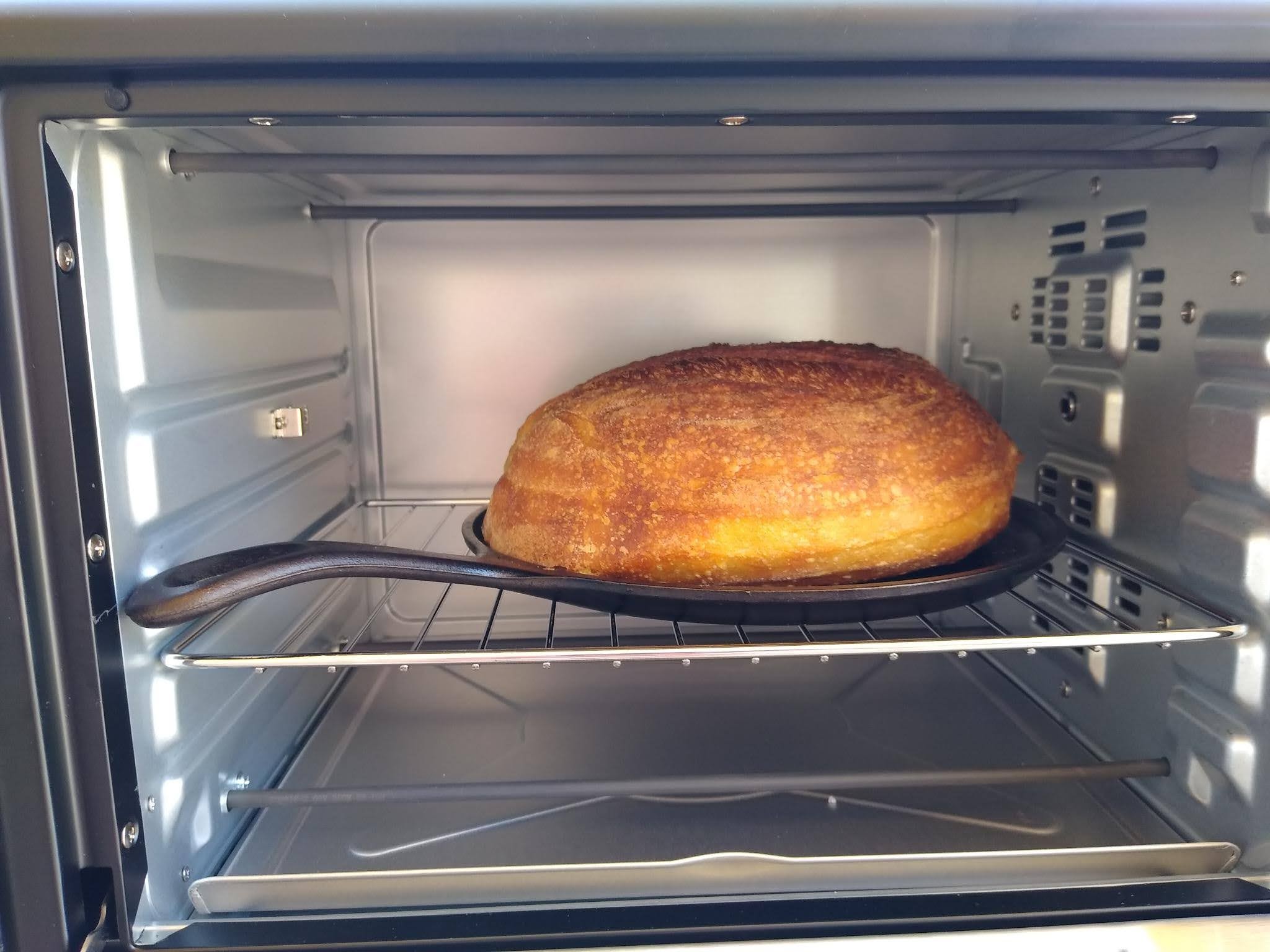 And this little oven does a great job maintaining a steady temperature, even after getting the bread in and out a couple of times. Likely the cast iron skillet helped even things out as well. Still, it seems up to the job overall.