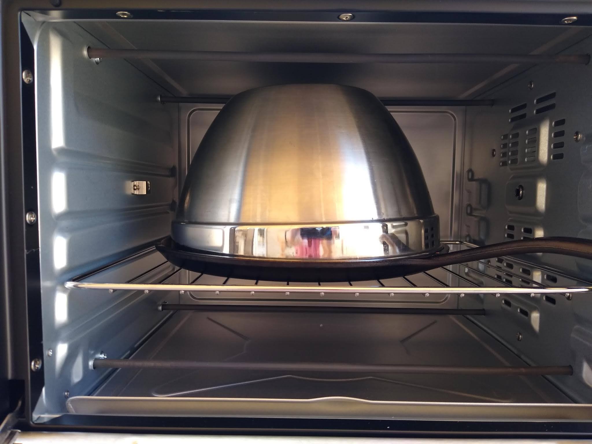 Banetton out of fridge after 14 hour retard. Toaster oven preheated for 30 min with a cast iron skillet inside. It JUST fits, lol. Lightly spritzed the dough and the inside of a stainless steel bowl with water. Baked at 450F covered with the stainless steel bowl for 20 min, then uncovered for additional 20 min.