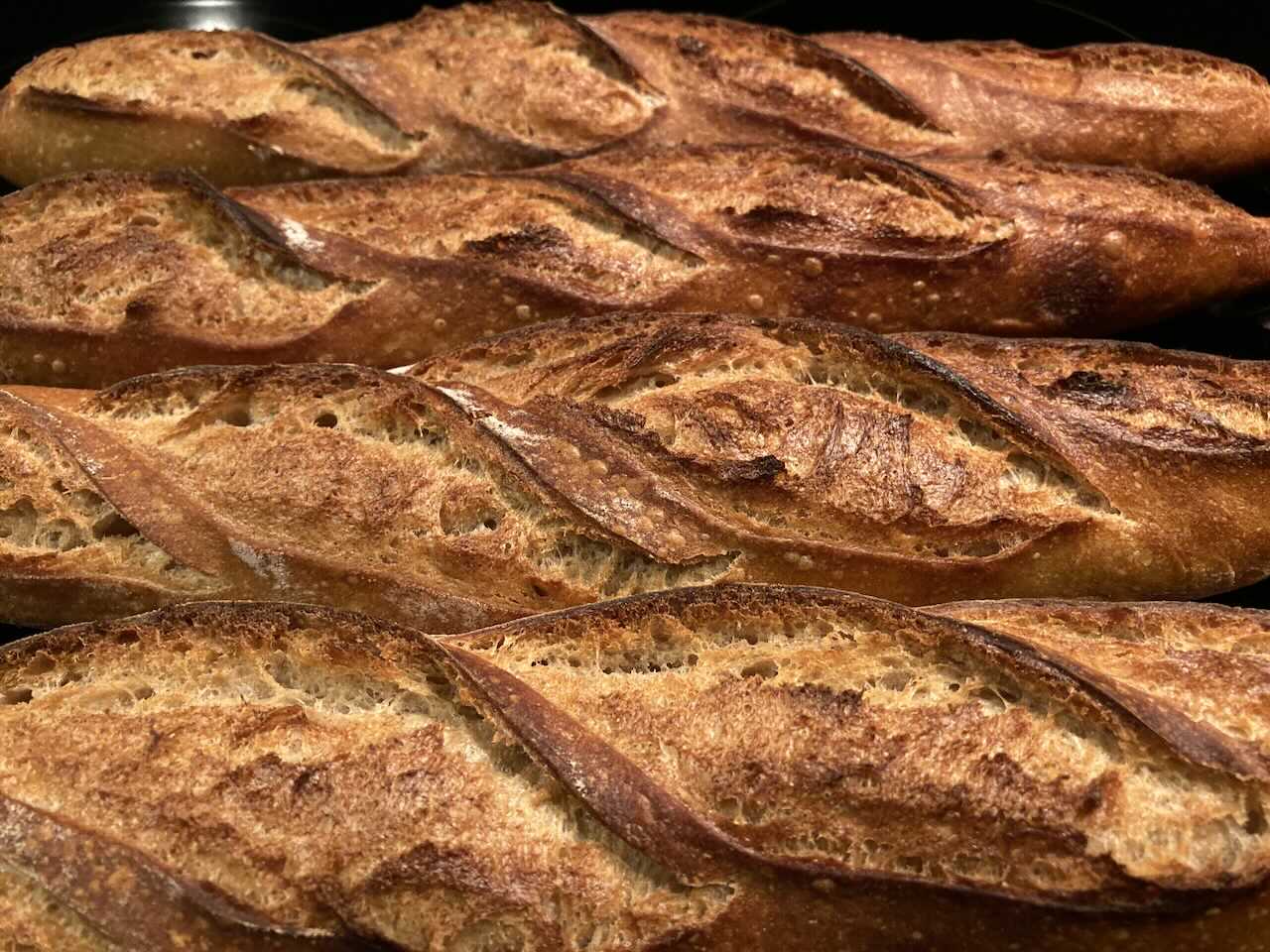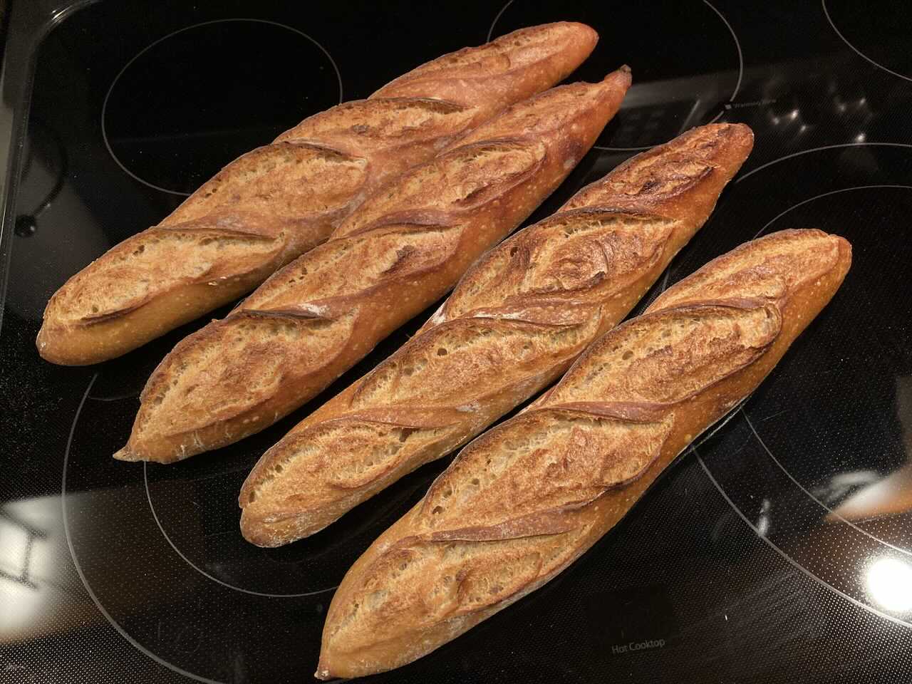 - Bake in 460dF oven with steam for 13 minutes, remove steam, rotate loaves, bake 12 minutes more, 2 minutes venting at end.