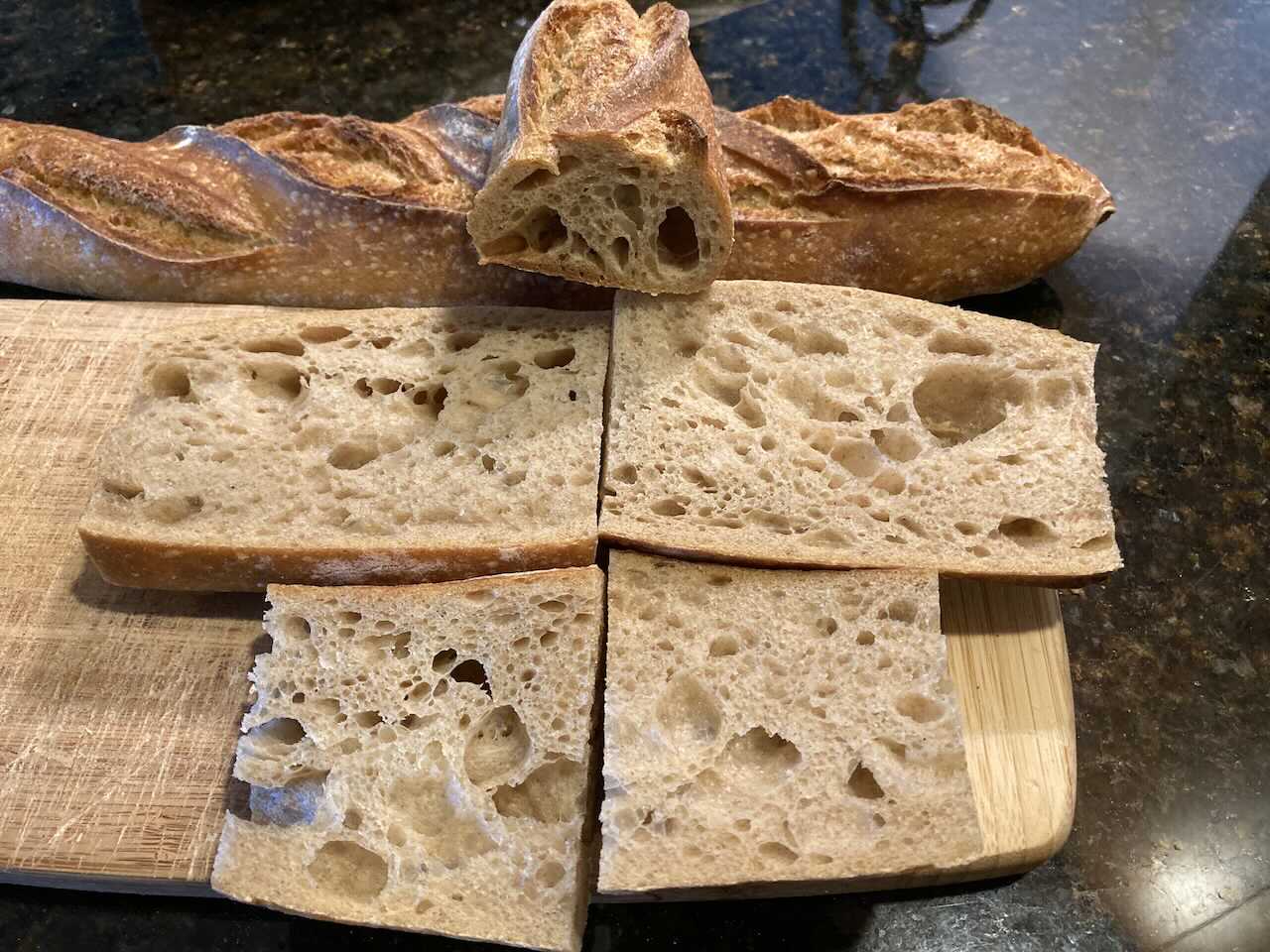 I've been busy lately between toying around with ciabatta and a bunch of batards, add the out of town stint to that, and it was a "while" since I last traversed the Baguette Trail, and it felt like "home". At 310g each, they are on the slimmer end of the spectrum for me, any lower would be ficelles. And after numerous prior bakes, I broke out a new corner of my double edged razor blade for the occasion. Whoopee.