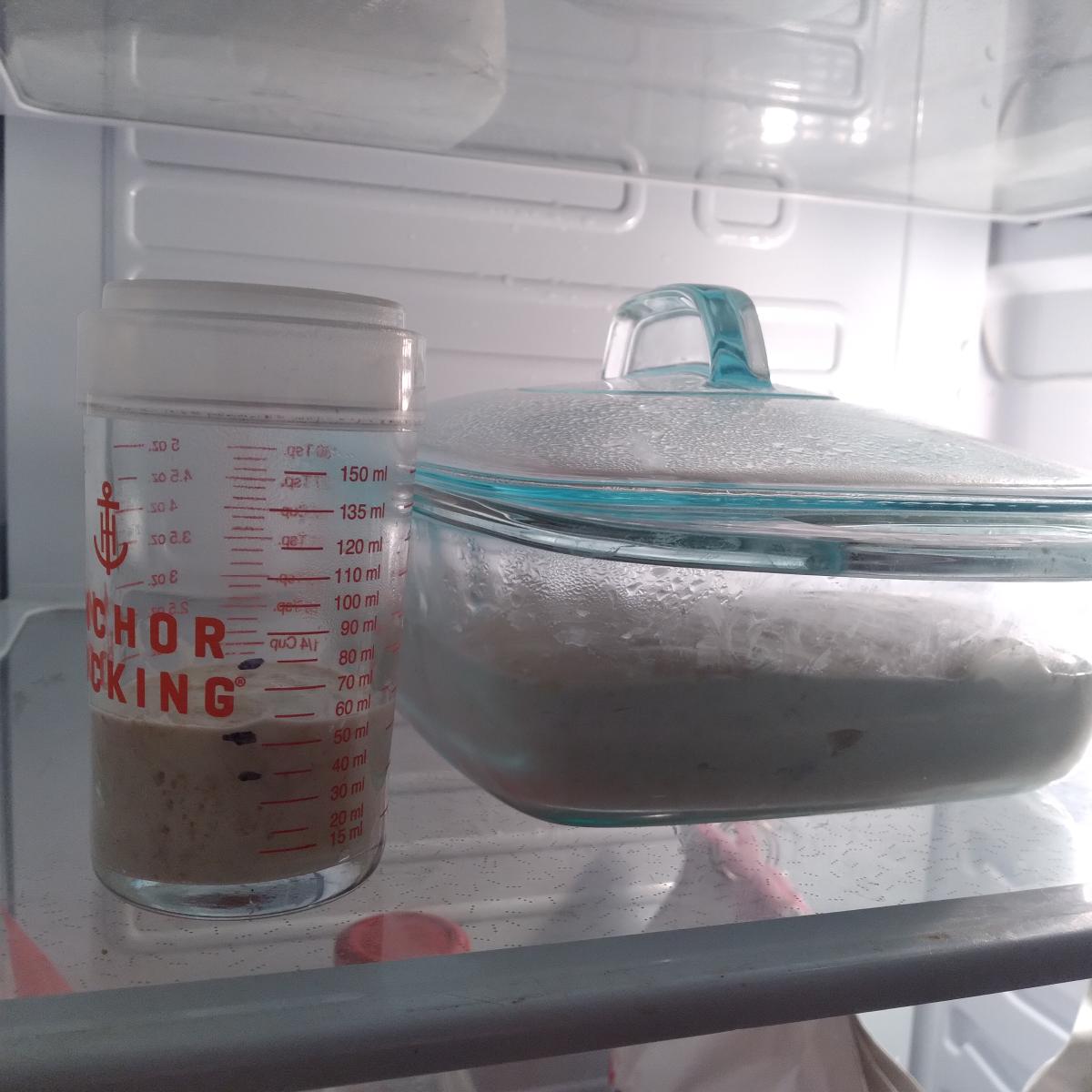 So here is a shot of my usual setup: aliquot jar next to the main container...I am not sure I understand what you mean by keeping the aliquot jar in contact with the main dough: do you mean that the aliquot jar should actually physically touch the main bowl?? or should it touch the main dough itself?? How would I do that?? I totally understand that the sample might warm faster than the main dough, especially just out of the fridge; it really makes sense now that you say it! Or maybe I should experiment with letting the sample rise to a greater degree (like 100 or even 110%)??