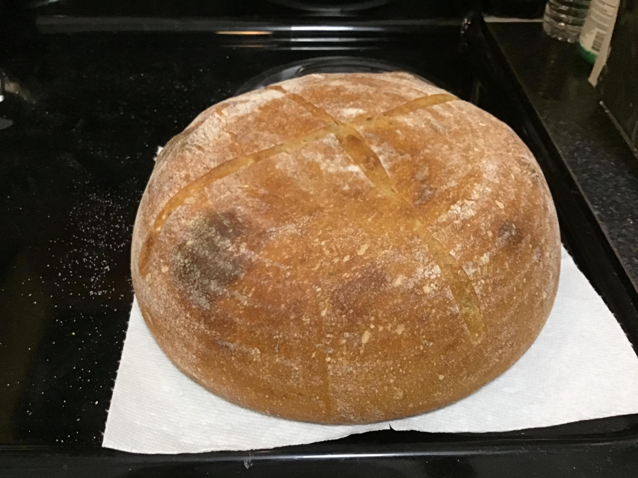 Friday the 28th: Baked on a 15" Lodge cast iron skillet, with an inverted stainless steel bowl as cover.