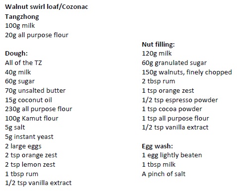 Adapted from: https://www.shelovesbiscotti.com/romanian-easter-christmas-bread-cozonac/ For the Cozonac filling: Over medium heat whisk together milk, sugar and walnuts. Stir continuously until the mixture thickens slightly. Add the *rest of the ingredients and continue stirring until it thickens to a sticky paste.