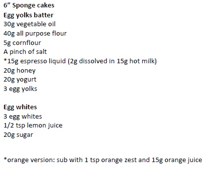 Orange sponge on the left used a 2-egg recipe, was mixed a little bit too carelessly (white spots here in there due to unmixed egg whites) while the coffee one on the right, 3-egg recipe, rose beautifully as I was gently folding the mixtures. Both were steam baked in 6" round pans. 3-egg version is loftier (also gives more cake!) So happy these were soft and spongy! Baked at 160°C in a water bath for 50-60 minutes.
