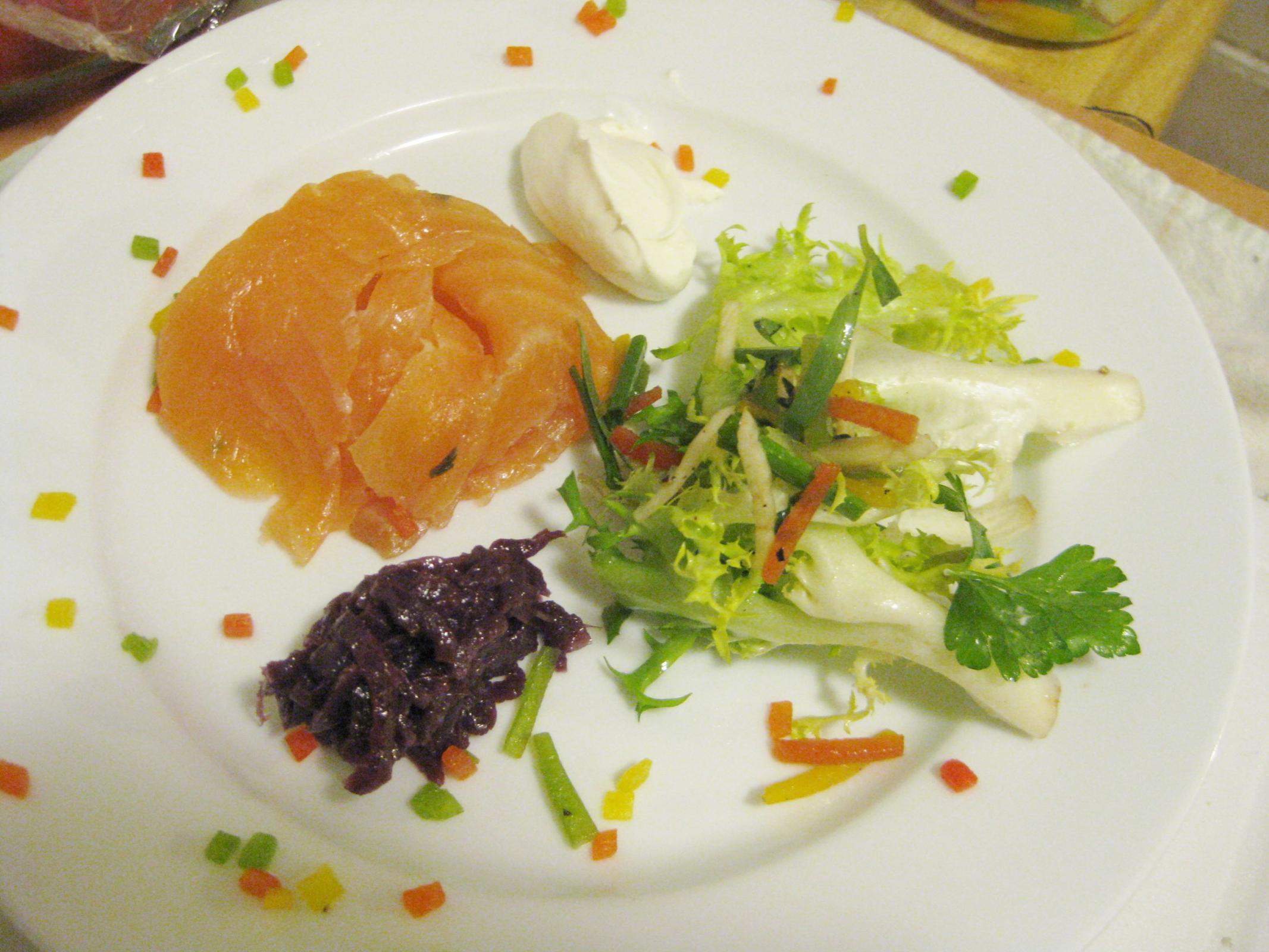 Part of a dinner with friends few years back. That's cognac, fines herbes and cracked black and green pepper-cured salmon with an herb salad from our garden, red onion confit, crème fraîche, brioche points and goofy little brunoises of pepper "confetti." (I sometimes like whimsy on a plate). Normally I do both cured and cold-smoked salmon, but I haven't had the proper event to break down an entire salmon and smoke a side, so my little cold-smoking cabinet has been retired for about 15 years now (no more. We're going to throw a party finally, a celebration, and salmon a' plenty).