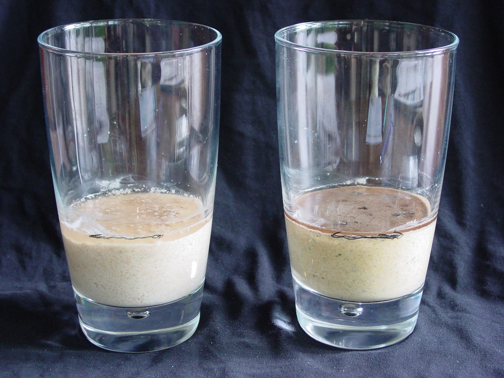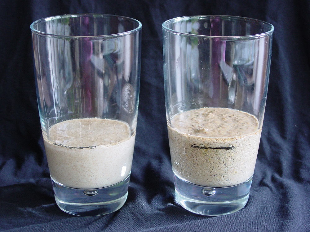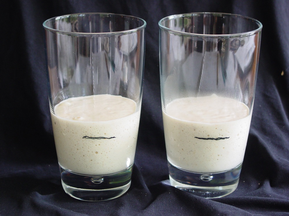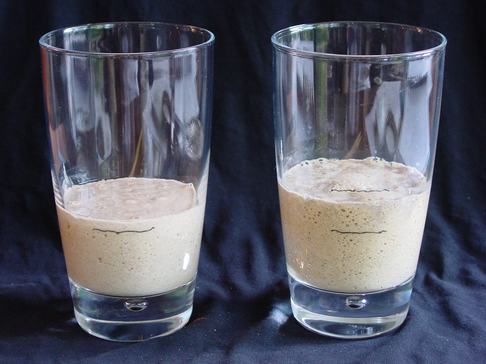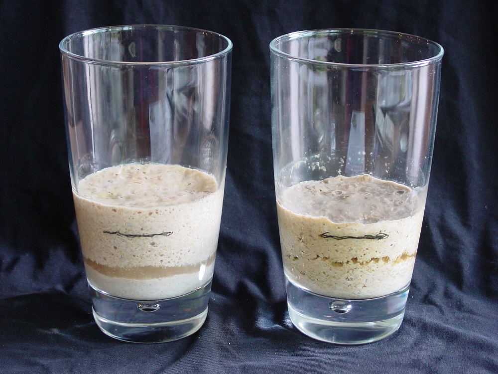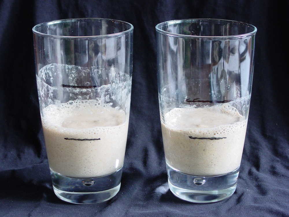 I then put the two side-by-side in glasses for an easy comparison.  Timings are marked on the sides of the glasses, the old starter is on the left in all the photographs.
