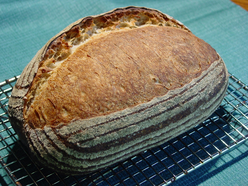 This is a favourite everyday loaf as it makes good toast, can be sliced nicely for sandwiches (quite soft crumb) and lasts a good few days.  I fiddle around with the wholemeal ingredients and sometimes stick some grains or seeds in. I find it difficult to get flavour to balance the sourness with low wholemeal levels.  I bake for 15 mins with steam then these took a further 35 mins at 180C - this gets a soft crust.  My oven manages simultaneously not to get really high temperatures and burn things, I find ali foil underneath and a baking tray on top deals with this.