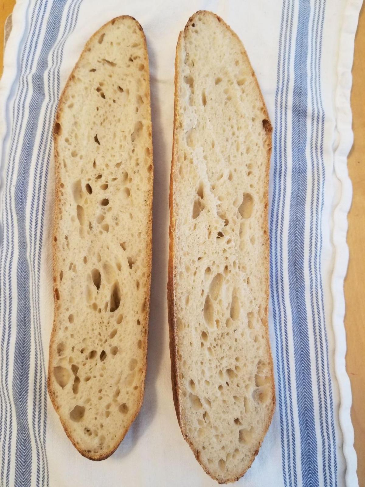 The set up is with the baking steel on the lowest rack and under it the broiling rack stuffed with crumpled aluminum foil. 2 levels above is the Sylvia towel in an old pan and a cast iron skillet. 30 mins into preheat I pour boiling water into the Sylvia towel pan and place it into the oven, the cast iron skillet is in for the whole preheat. When the baguettes are loaded, 250 mL of boiling water are added to the skillet. The temperature is dropped to 480ºF and baked with steam for 13 mins. After 13 mins both the Sylvia towel pan and cast iron skillet are removed.