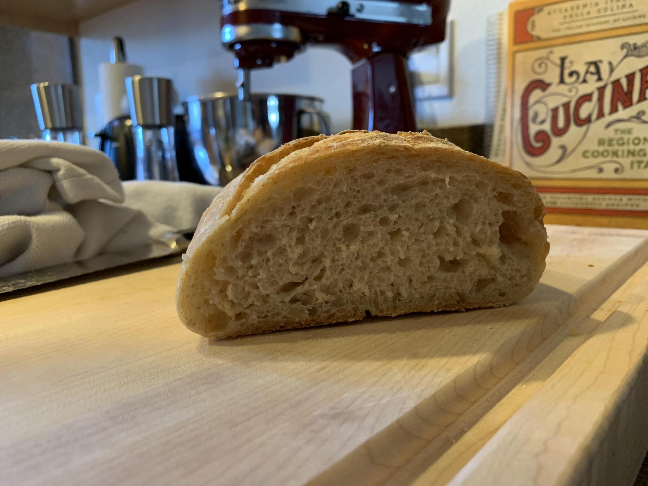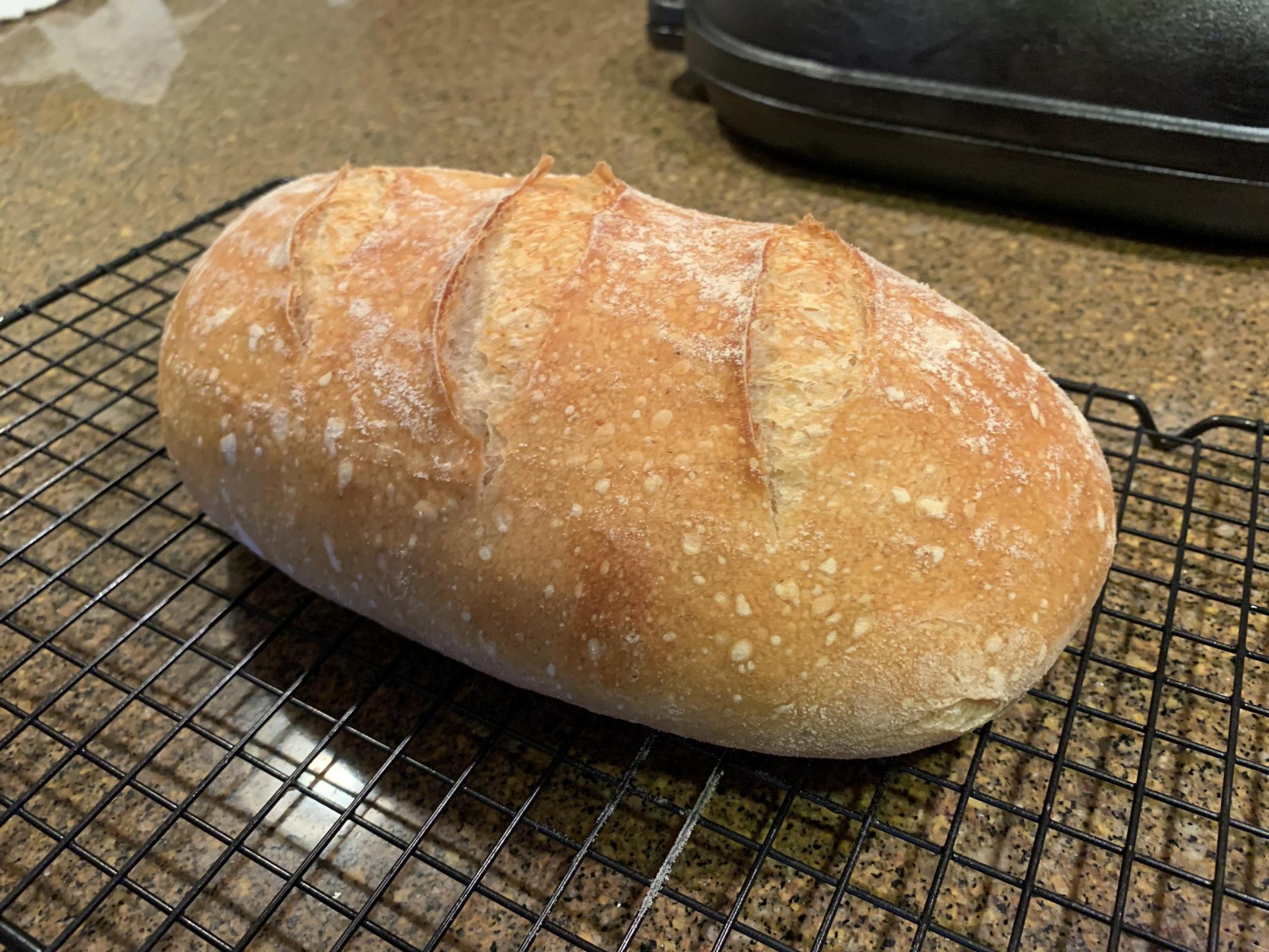 That was fine I think. It didn't deflate when I scored it. But I think it looks a bit flat, not that much oven spring. Here's what the result looks like: