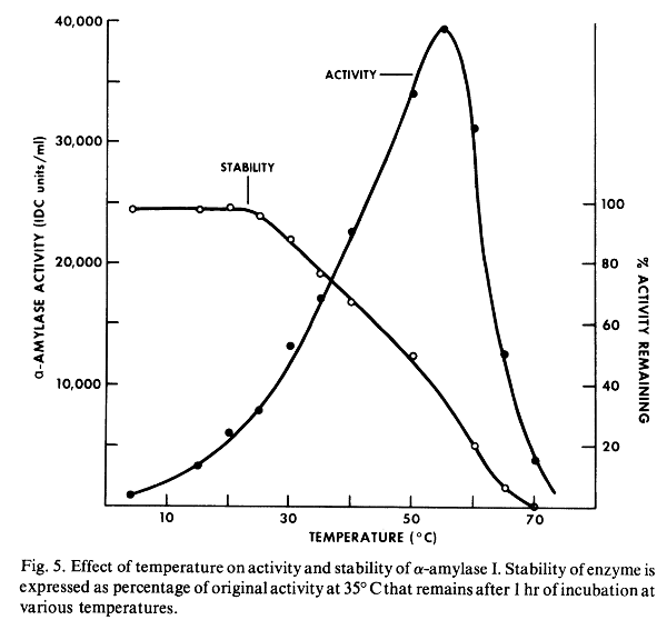 If I'm eyeballing it correctly, after 1 hour at 62C the amylase is maybe 15% active. It started at about 20000 and dropped to 3000 after one hour. Looking at 25C, I see about 8000 units of activity and nearly 100% stability.