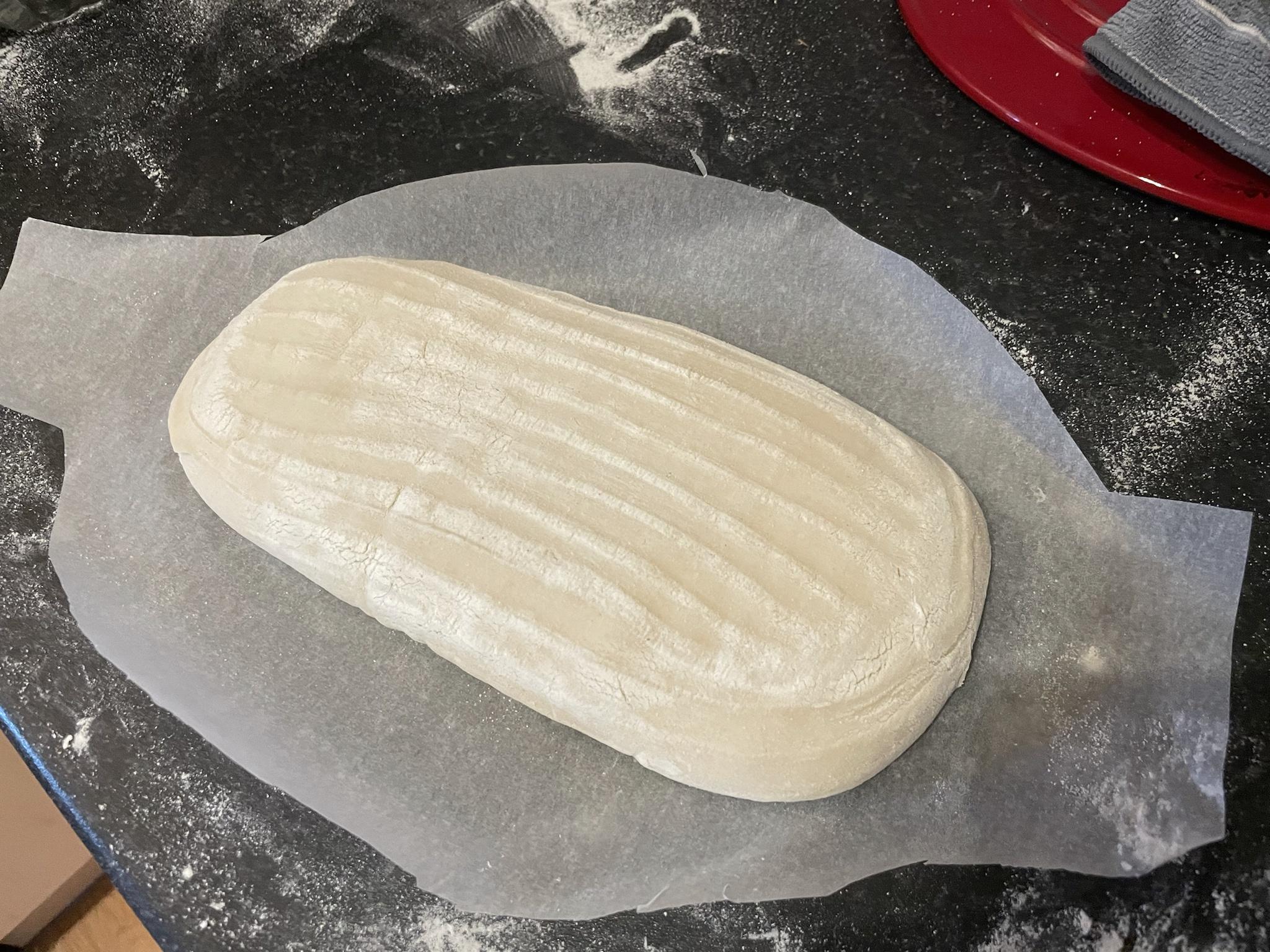 - Loaf stuck to the banneton slightly at once side so stretched itself long and thin when removing onto parchment