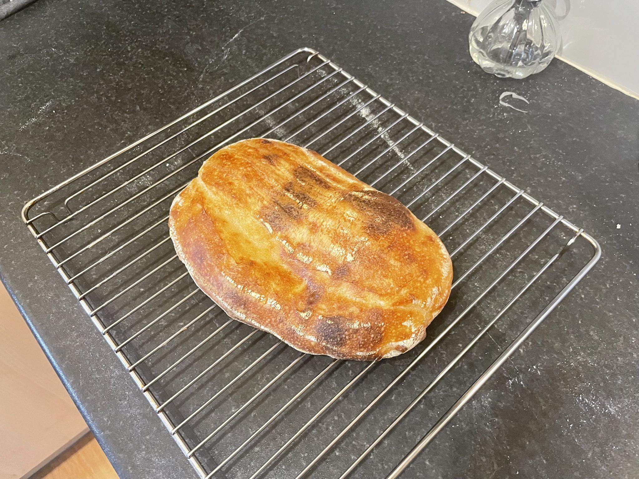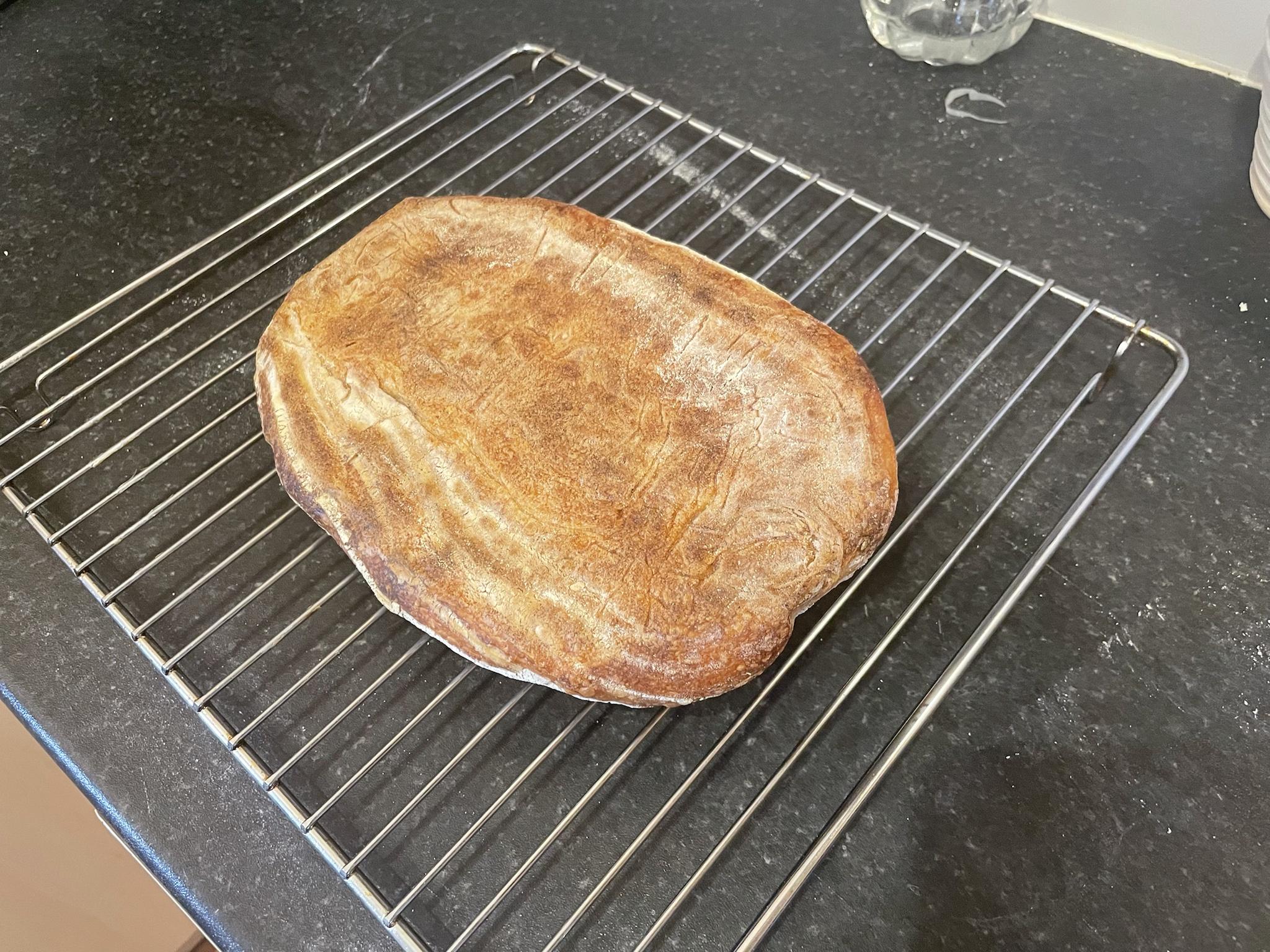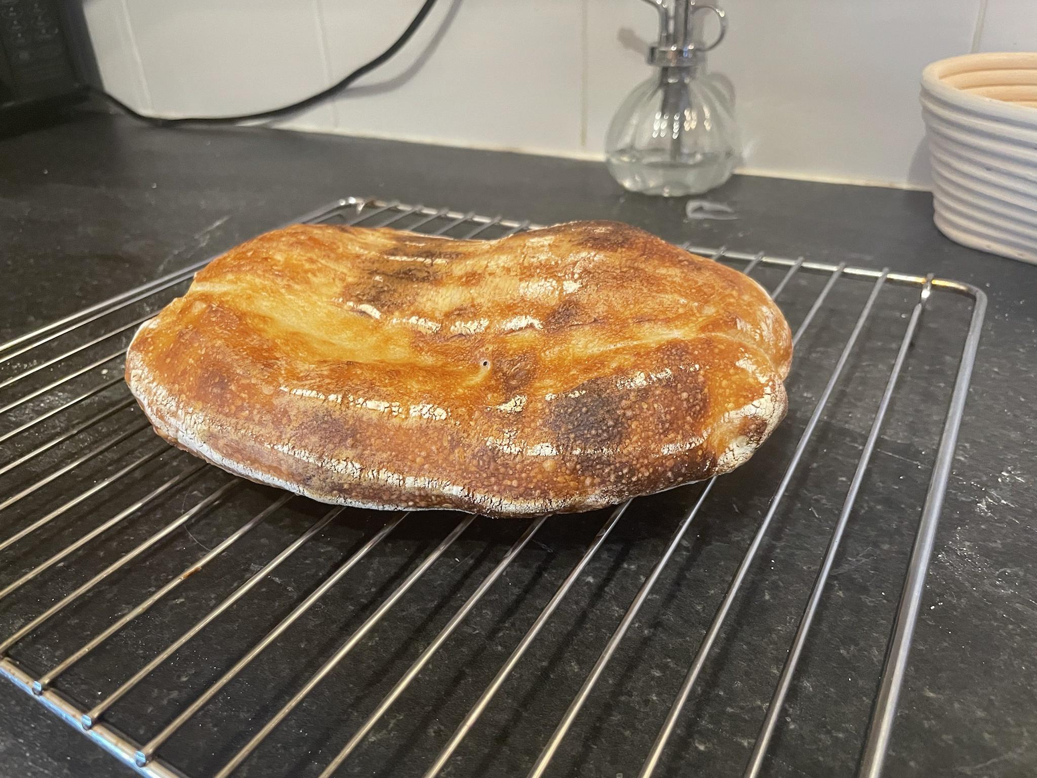 It is a misshapen flat mess. I wasn't expecting a huge, ballooned loaf because it wasn't a particularly big loaf relative to the size of the banneton so it was always going to be a bit long and short but this was not what I had in mind!