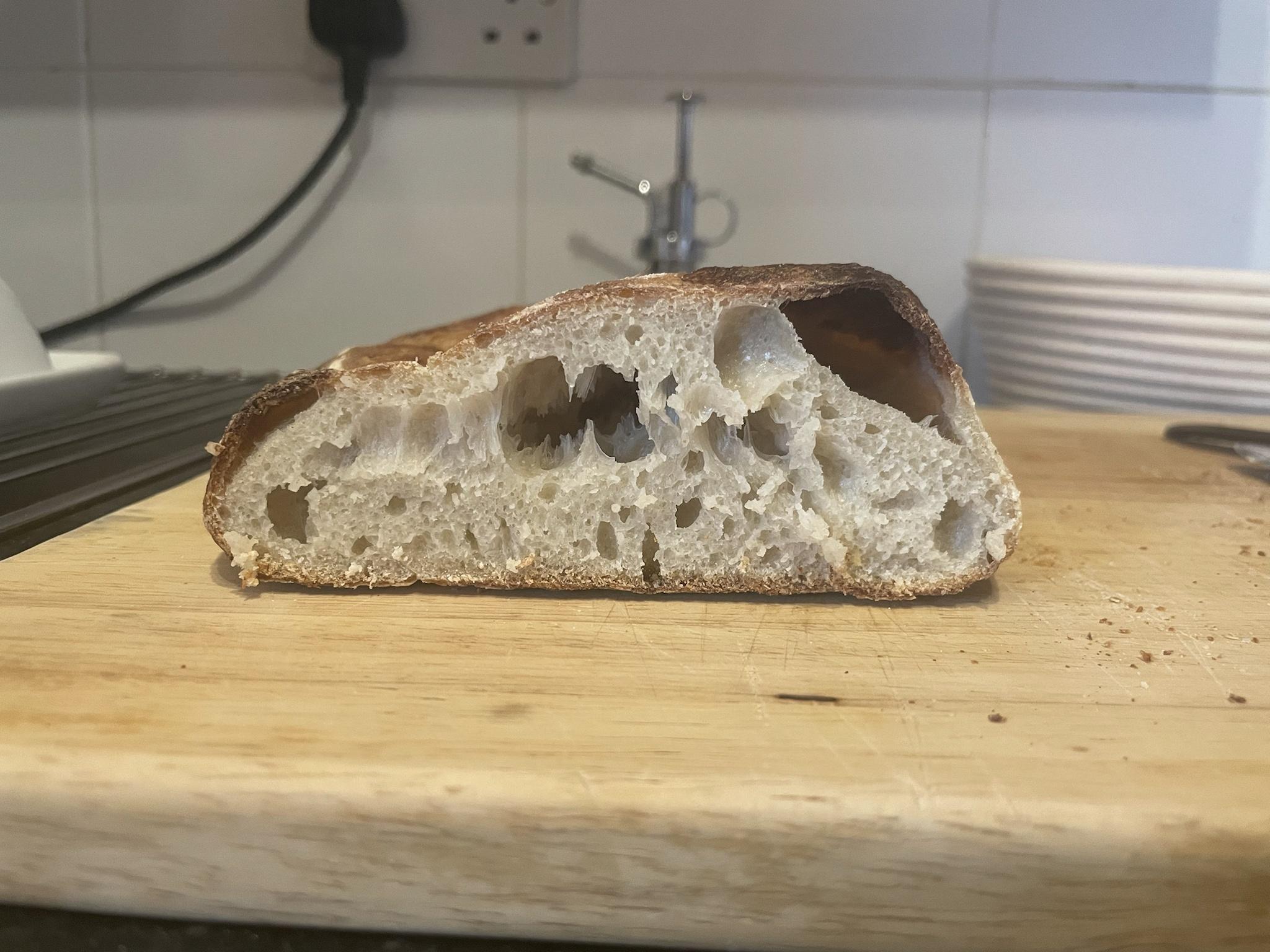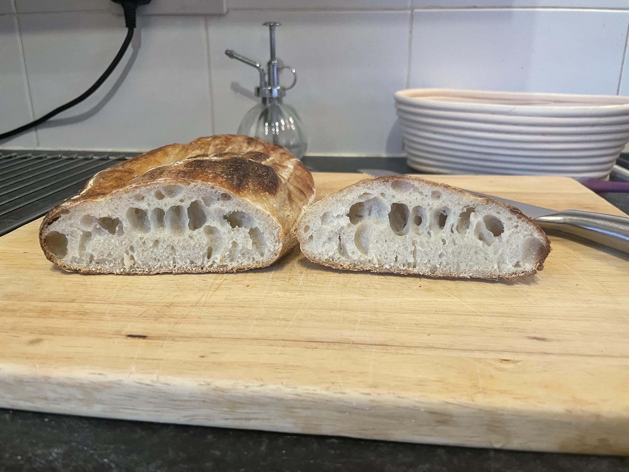 I'm also surprised to hear you think it was under-fermented. My original plan was to ferment it at 17C for the full 24h but after just a few hours of the bulk process it was growing like crazy. It had lots of air bubbles forming on the surface of the dough and just in the 30-45 minutes between coil folds it was increasing in size by c.50% each time.
