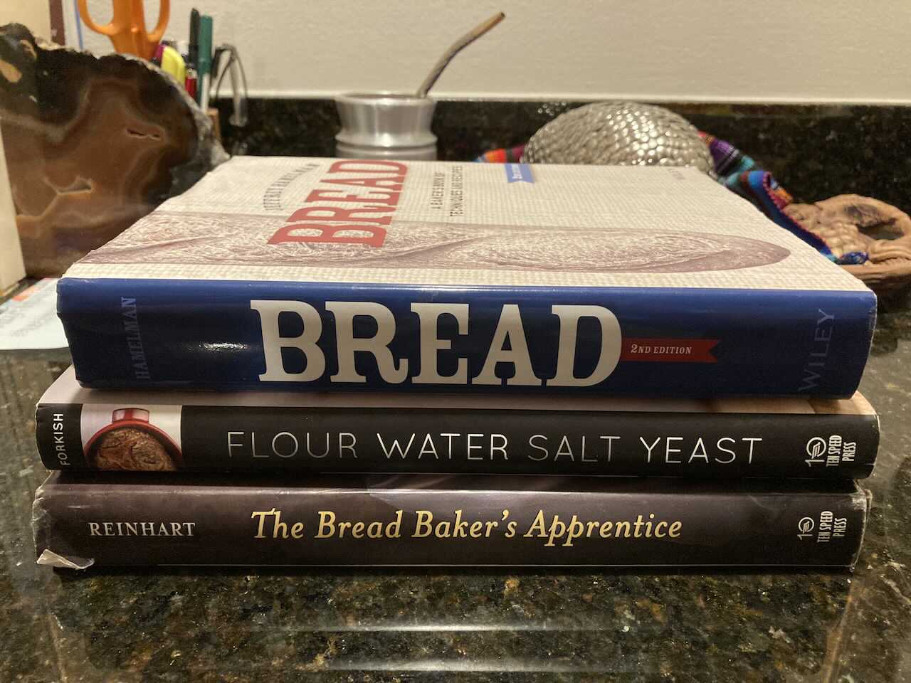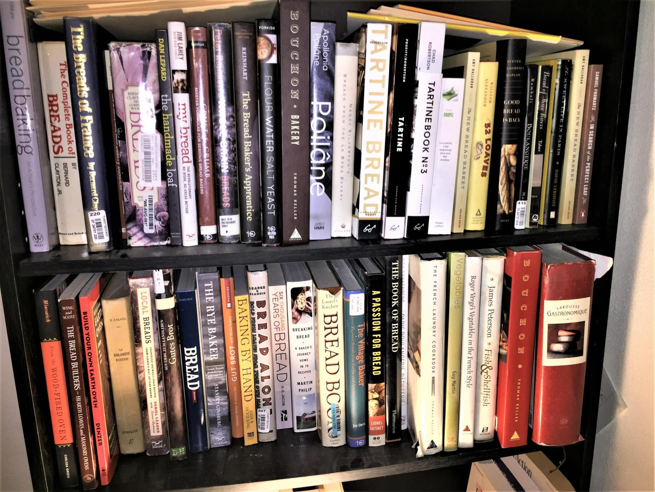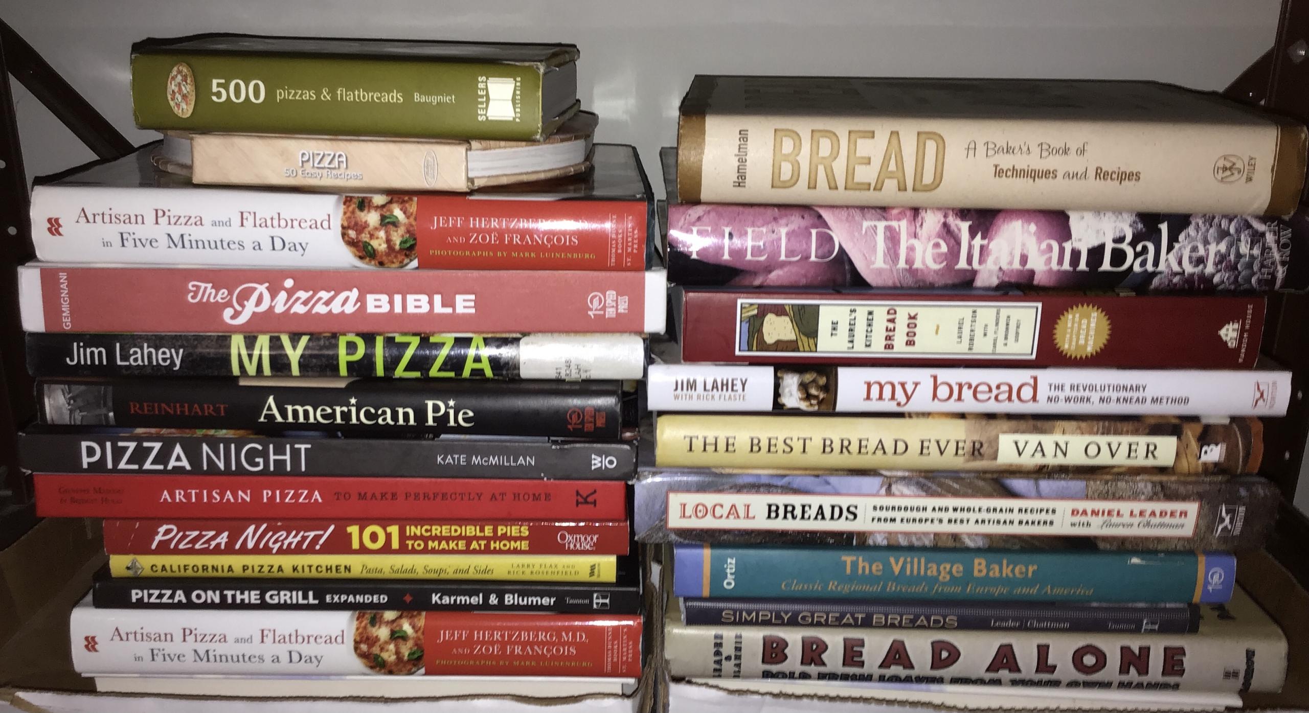 Upper left stack is pizza. The other 3 stacks are bread. The Tassajara Bread Book is a 14th printing (1974) of the 1st edition, 1970; and is likely the most valuable of the collection. I forget where I picked it up, but it was likely in the pre-Internet days. Going price is $75+ last I checked online.