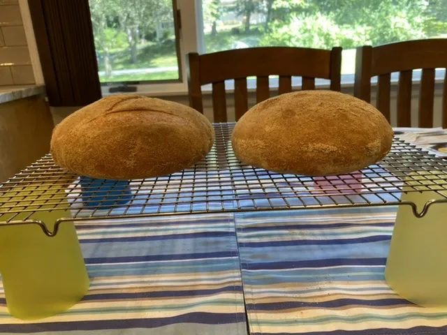I haven’t baked in a while, so I turned to DL’s Country Classic Hearth Style bread since he calls it a learning recipe and I haven’t baked in a long time. Everything was going well, and I gave the final proofs the old poke test which indicated it was just about right, albeit 40 minutes early. Room temp was 78 degrees, as were all the ingredients as I went through the process (my daughter is away at school and I’ve had a thermometer setup for days so I fermented and proofed in her room). I used 8” bannetons with well floured linens that came off easily when I put them on the peel to slide in the oven on my well used baking stone which was heated with the oven for an hour. I scored them lightly with a very sharp carving knife, I quickly sprayed the water on the oven walls to create the steam, left it baking for 3 minutes and quickly sprayed steam again. I cooked them as prescribed by DL.