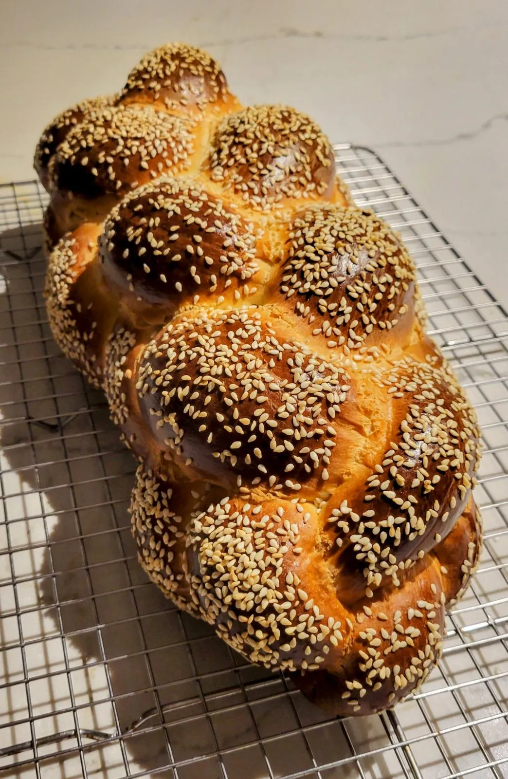 The recipe includes 100% KAF AP flour, 42% hydration, 22% sugar (we like a sweet challah; split between sugar and honey), 4% yeast (fresh package of SAF-Instant Gold), 2% salt. I am in South Texas (plenty of humidity; kitchen temp 74 degrees F).