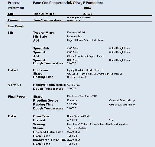 I liked the overall consistency of the bread. It has a nice crust and the 00 flour has a nice creamy taste to it. My only modifications when making it next time would be 1) to increase the amount of red pepper flakes to maybe twice the amount, but then I have a real taste for spicy foods, 2) a little less hydration. Recipe and process are below for those interested.
