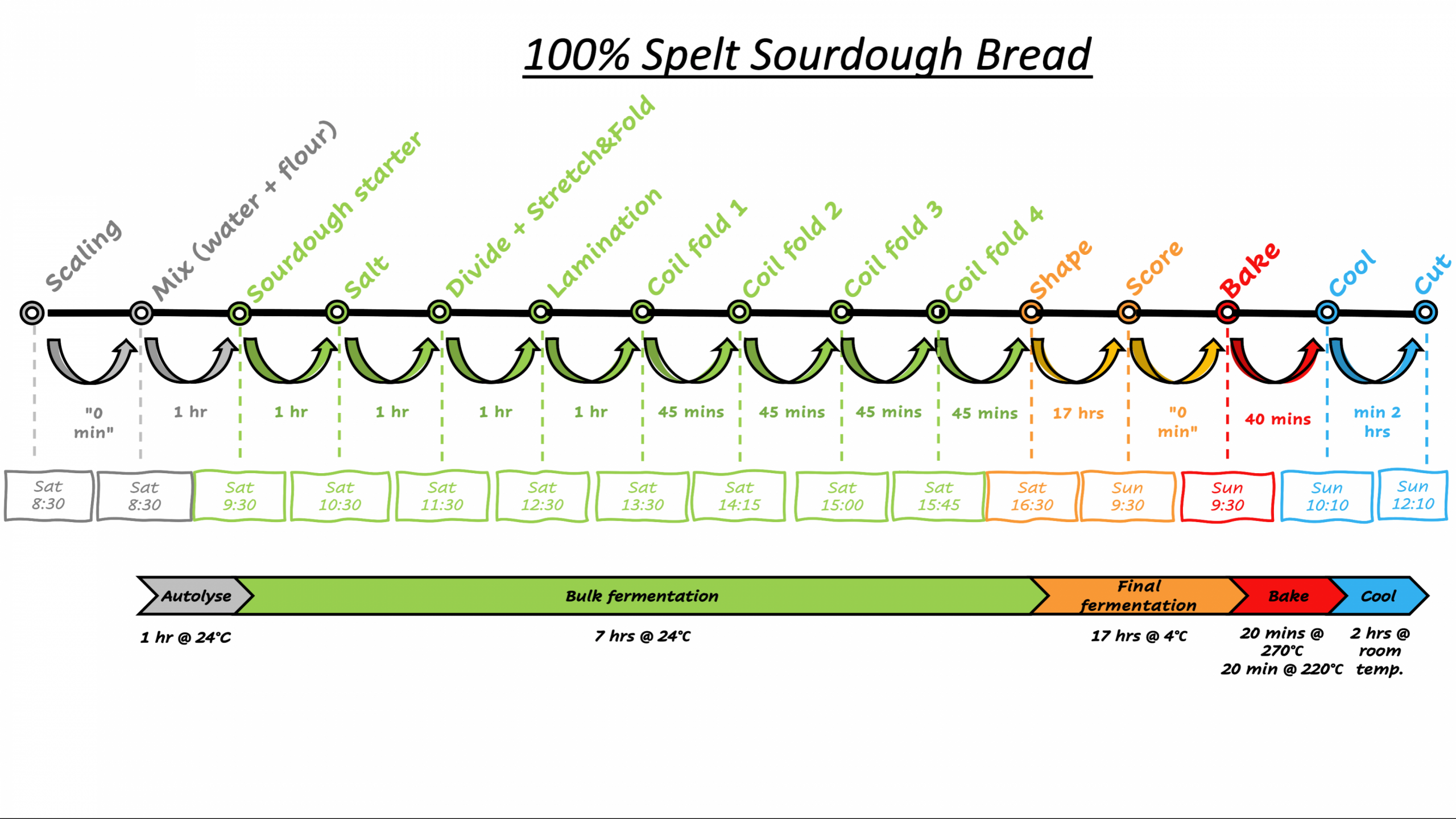 White spelt flour is an interesting variation to wheat. I made this bread more for testing purposes but will not be between my daily bakes. Instead, I would add something like 10-20% of spelt in a country bread and this would provide increased extensibility and improved flavour. To recognise the characteristics of spelt, testing it in a 100% spelt loaf is a good lesson.