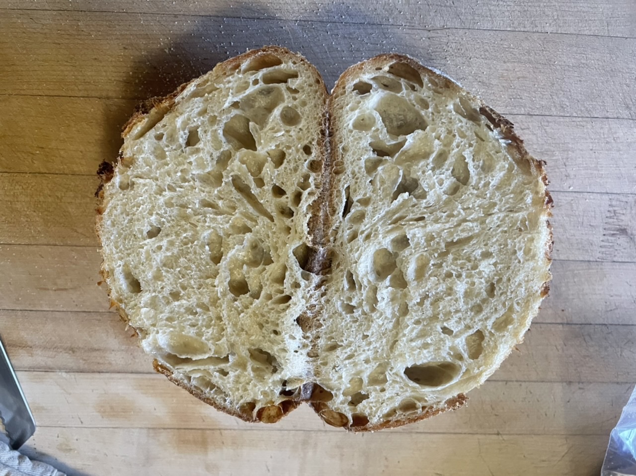 This was an interesting bake as I don’t remember the last time I just used plain white flour to make a loaf of bread. Reason for making this is that my dad is in dialysis and his diet is extremely restricted. Plain white sourdough bread is allowed. So the only bit of whole grain comes from the starter and comes out to only 25g per loaf. The dough felt very different than what I’m used to dealing with. I added an undetermined amount of water when it was in the mixer because it was too stiff so water amount is a guess.