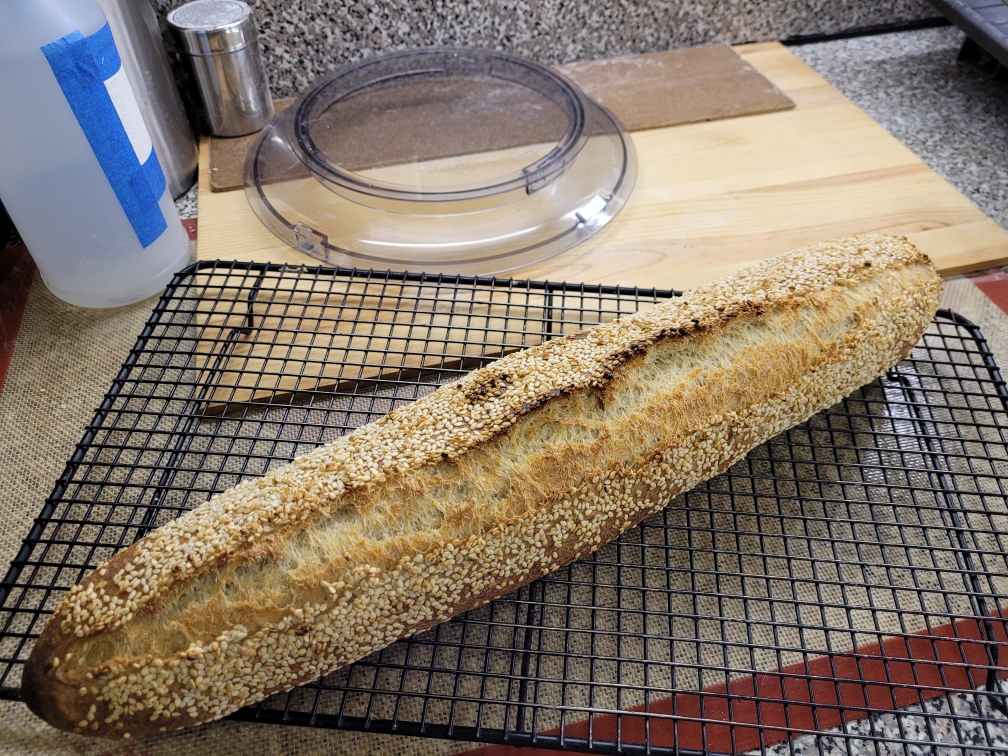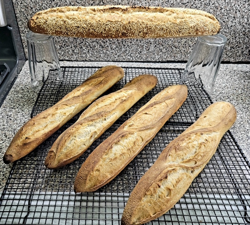 On the first day of vacation, getting my bake on. First loaf out of the oven. The Perfected Falzon Filone. (I love this part semolina bread) The second batch (4 @ 400g baguettes in autolyse.)