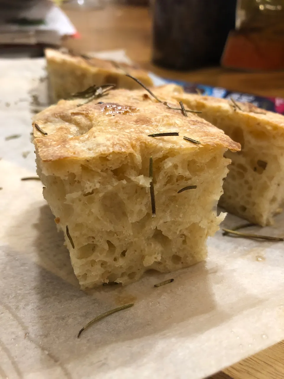 I did something different with my foccacia this time. I used the KA mixer with the dough hook on it for 5min before bulk fermentation (whereas I used to do nothing) , bulk for 18 hrs. Is this overfermented or is it because I used the mixer on it? the first photo is my regular technique, second one KA mixer. Sorry my friend sent me the second pic. Hard to see the crumb