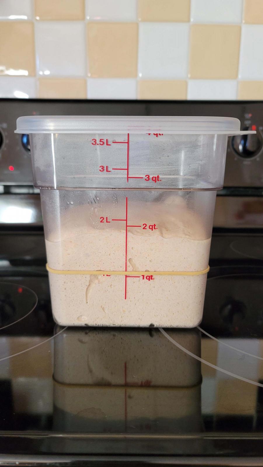 Is this (pictured) the greatest thing since sliced bread :)? I use this container to gauge bulk rise along with an aliquot jar (populated by Kristen Dennis). The pic is little deceptive from the camera angle but the dough rose about 80% which I usually shoot for to end bulk rise for a sourdough baguette dough (very slow rise). The small dough in the aliquot jar (not pictured here) will follow through until the end or until the dough go into the hot oven. I also bake the dough in the aliquot jar and swallow the min baguette whole :).