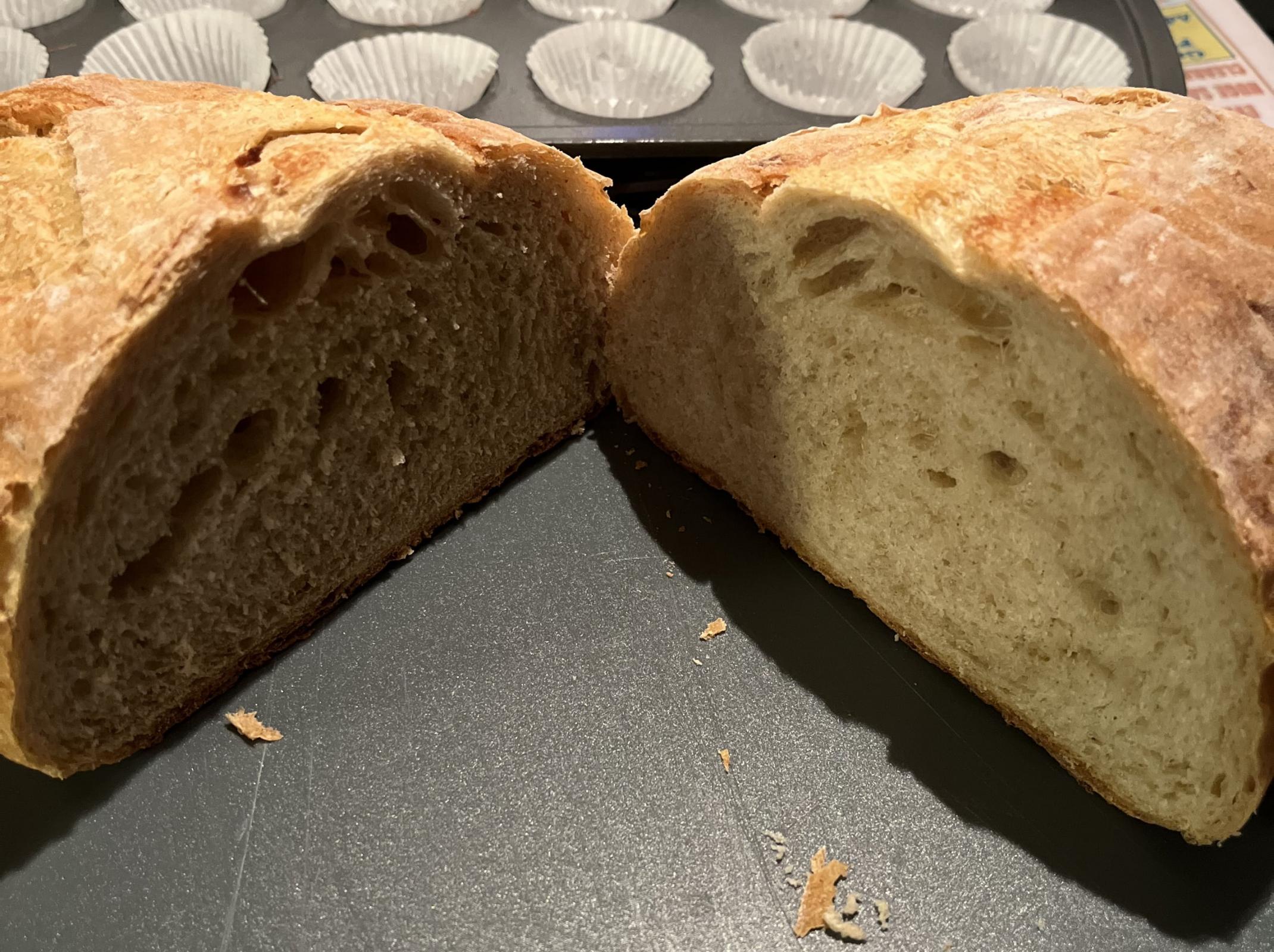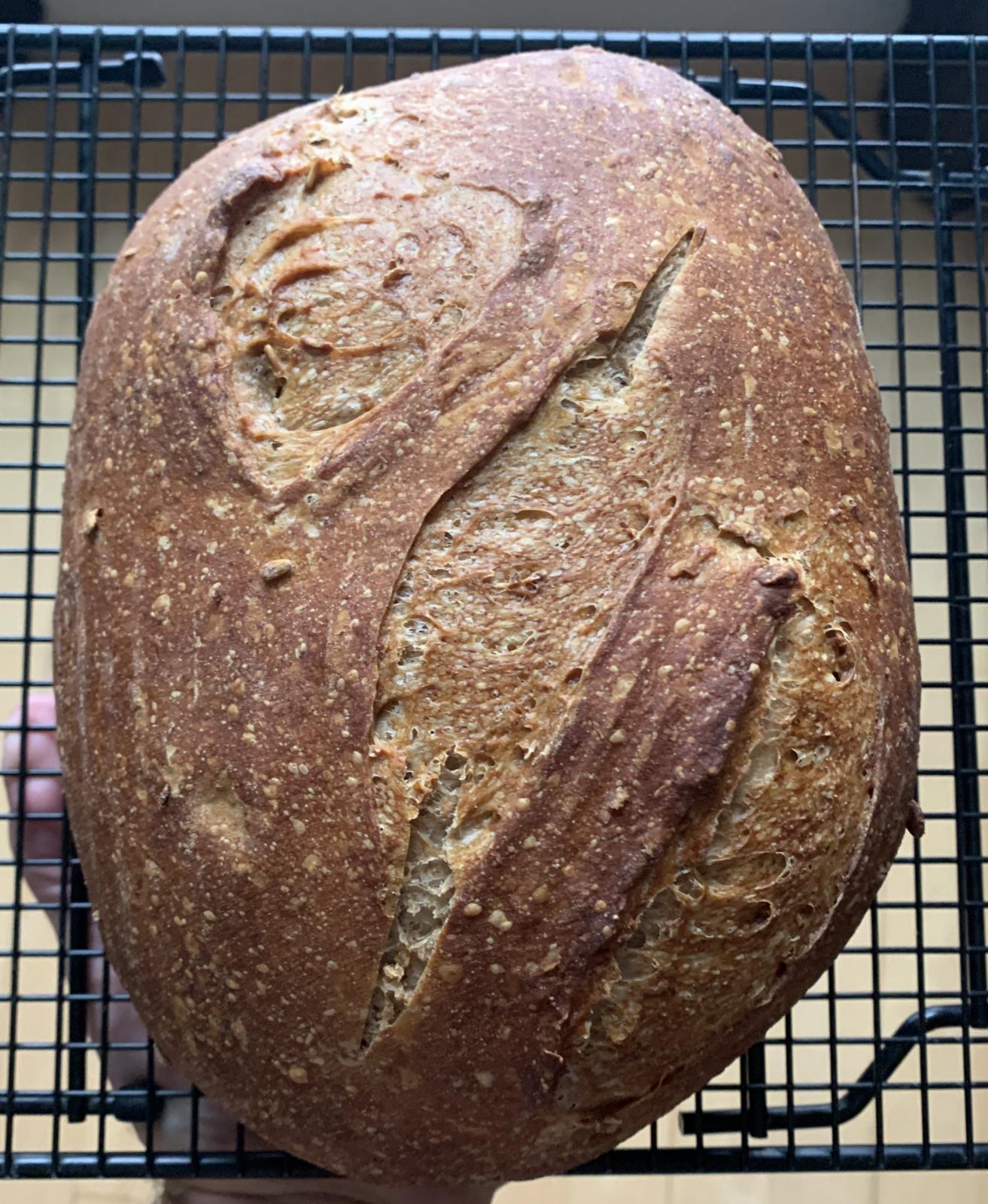 The first time I made the bread, the bottom crust was on the verge of burning from the potato starches (450 deg F during steaming), so this time, I dropped the temps during baking. Bottom crusts looked great, but I would have liked to get a little more color in the top crusts. That being said, this bread is one of the most tender and soft I’ve made to-date (based on squeezing the loaves while bagging them) and had a nice potato aroma! All these loaves were spoken for, but a friend did send a crumb shot. Bit of a bad angle. Overall, I think it looks OK but it was unfortunate seeing the large holes. Not sure if that was the rapid rising or if I didn't fully degas before the final shaping.