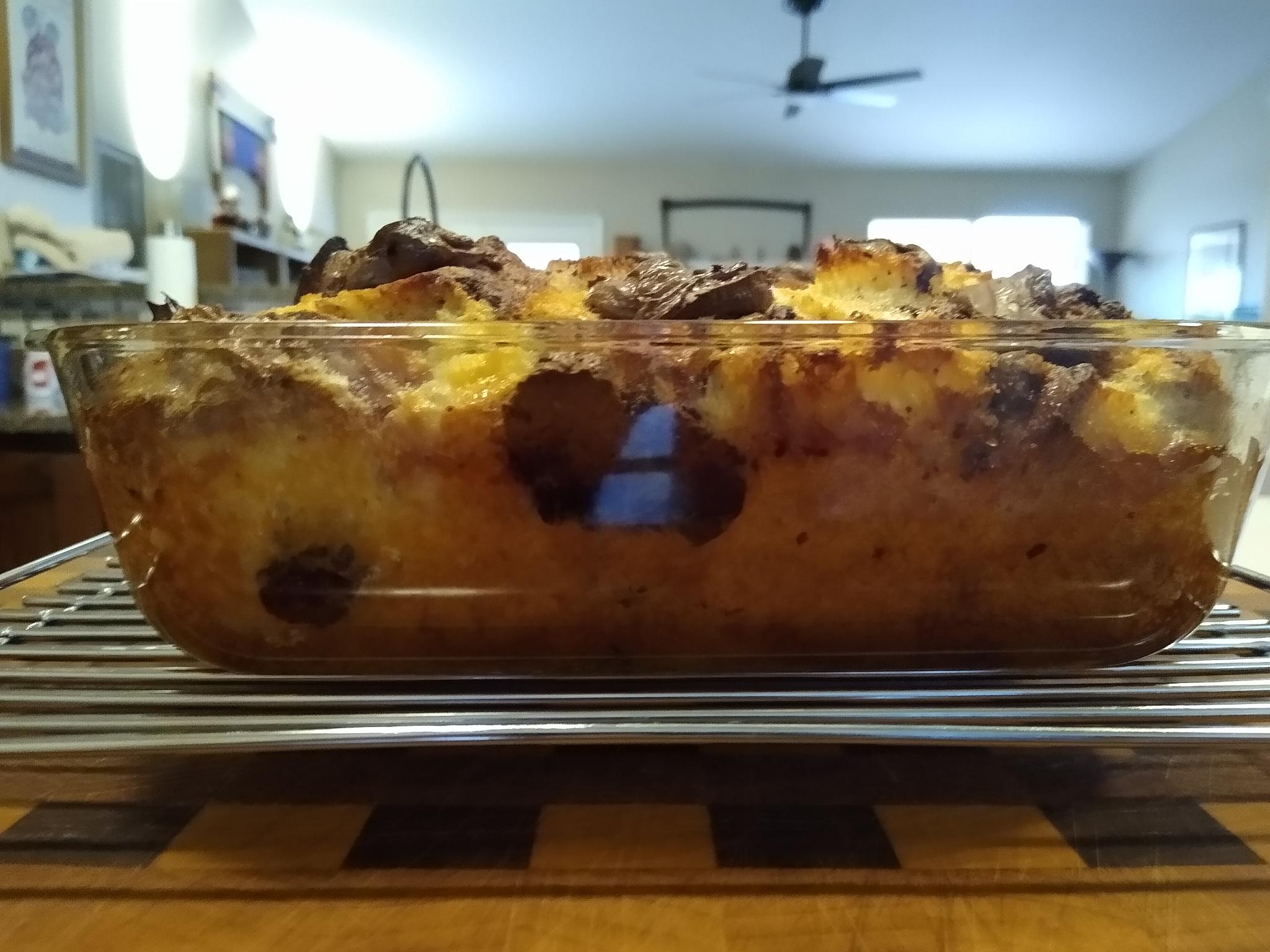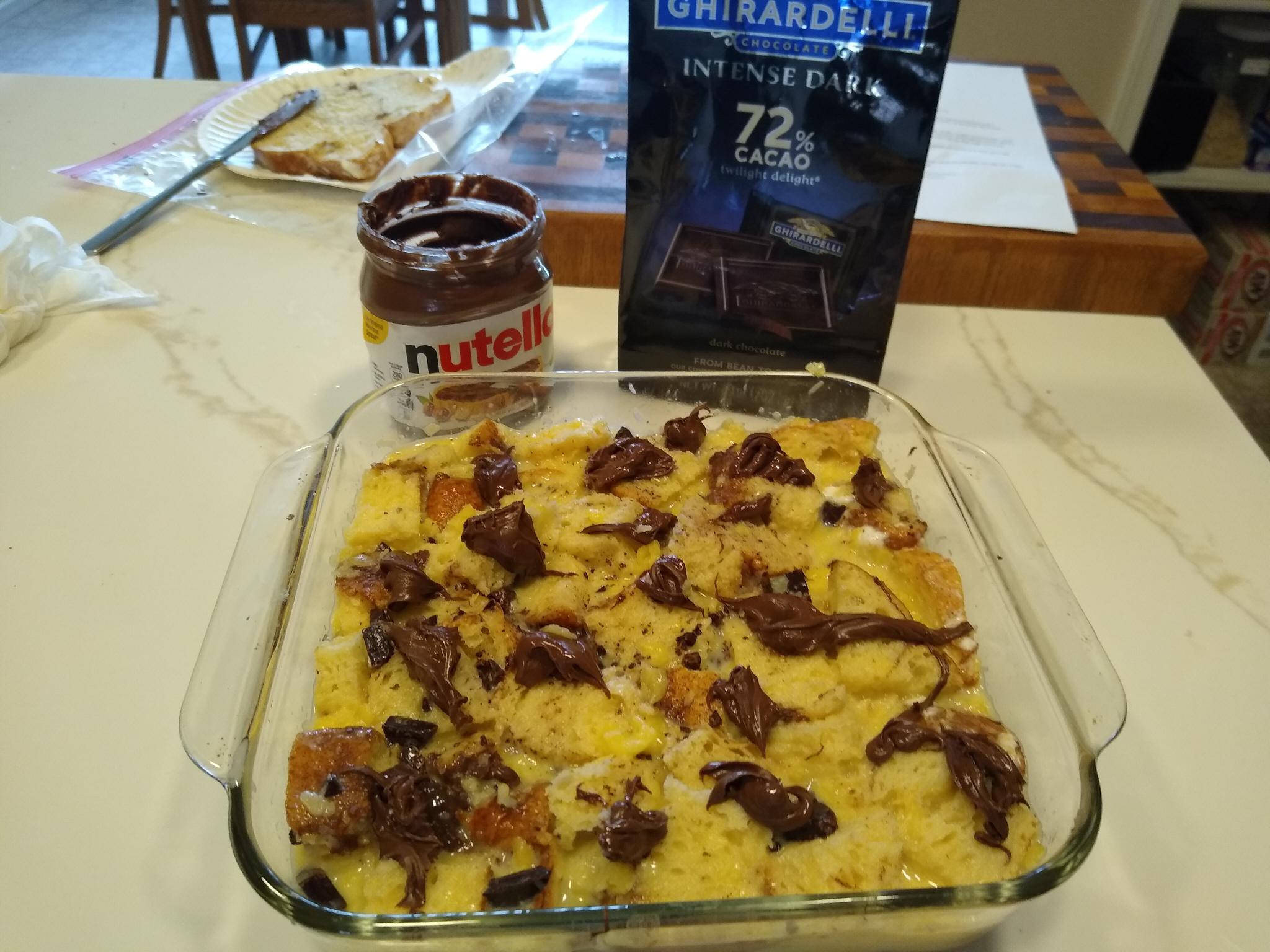 Babka was cubed and put into an 8x8 in pyrex. The dark chocolate was broken up into small chunks and distributed throughout the bread cubes. The pudding recipe was mixed as described, though I used just a little less sugar and left out the cinnamon. I thought about including it, I like Mexican cocoa etc. But I am bringing this to a holiday gathering, and wasn't sure if others would appreciate the combination. After pouring the mixture over the bread and chocolate, I used a fork to gently push the babka chunks down into the mix. I had a little leftover Nutella to use up,so at the last minute I dolloped some on top of the concoction for good measure.