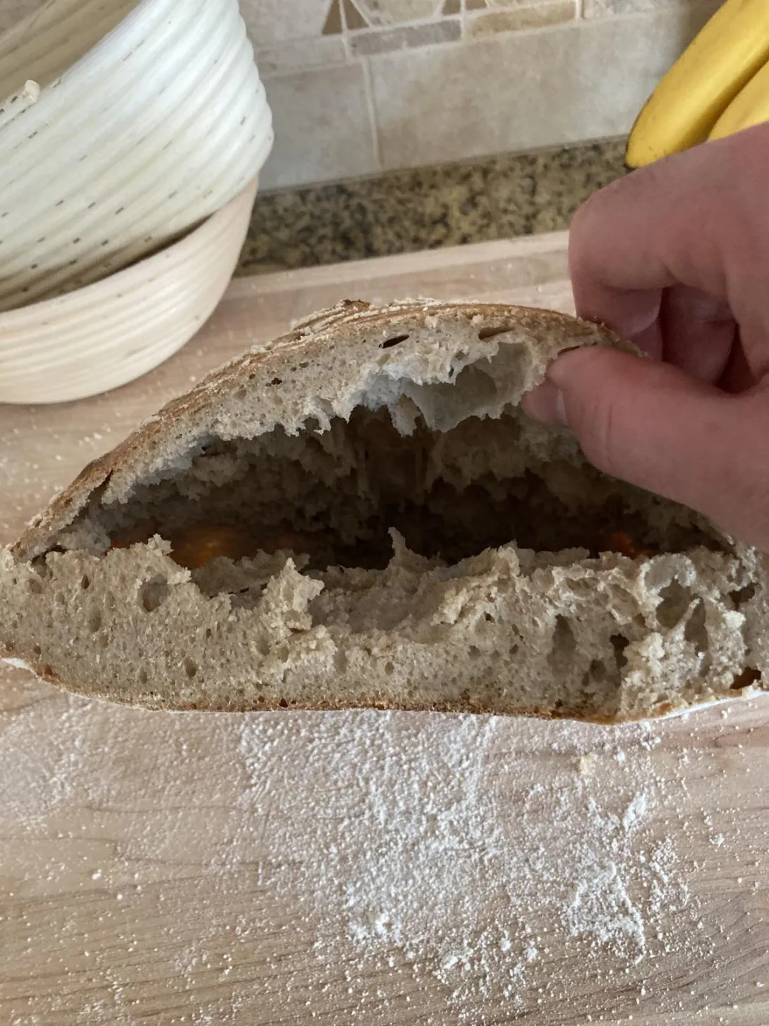 But the one big cavern with ragged "stalactites" hints at gluten breakdown from too much acid or some other reason. (Regular under-fermentation usually has tunnels, not one big cavern due to a collapse.)