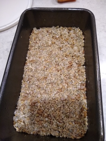but I would rely on my sense of smell during this bake. I have not baked this recipe. There is a lot of stored moisture in the cooked grains but the mixture in the pan looks a bit dry to me. I dont expect too much rise from a retarded rye unless there is enough wheat in it to keep the gasses from leaking out during the refrigeratation.