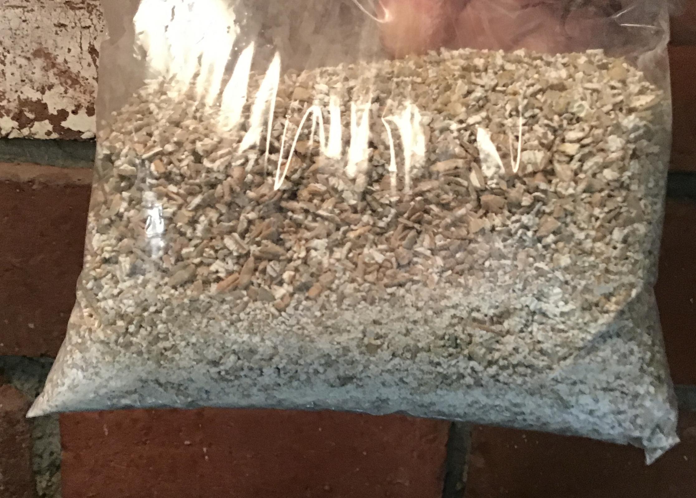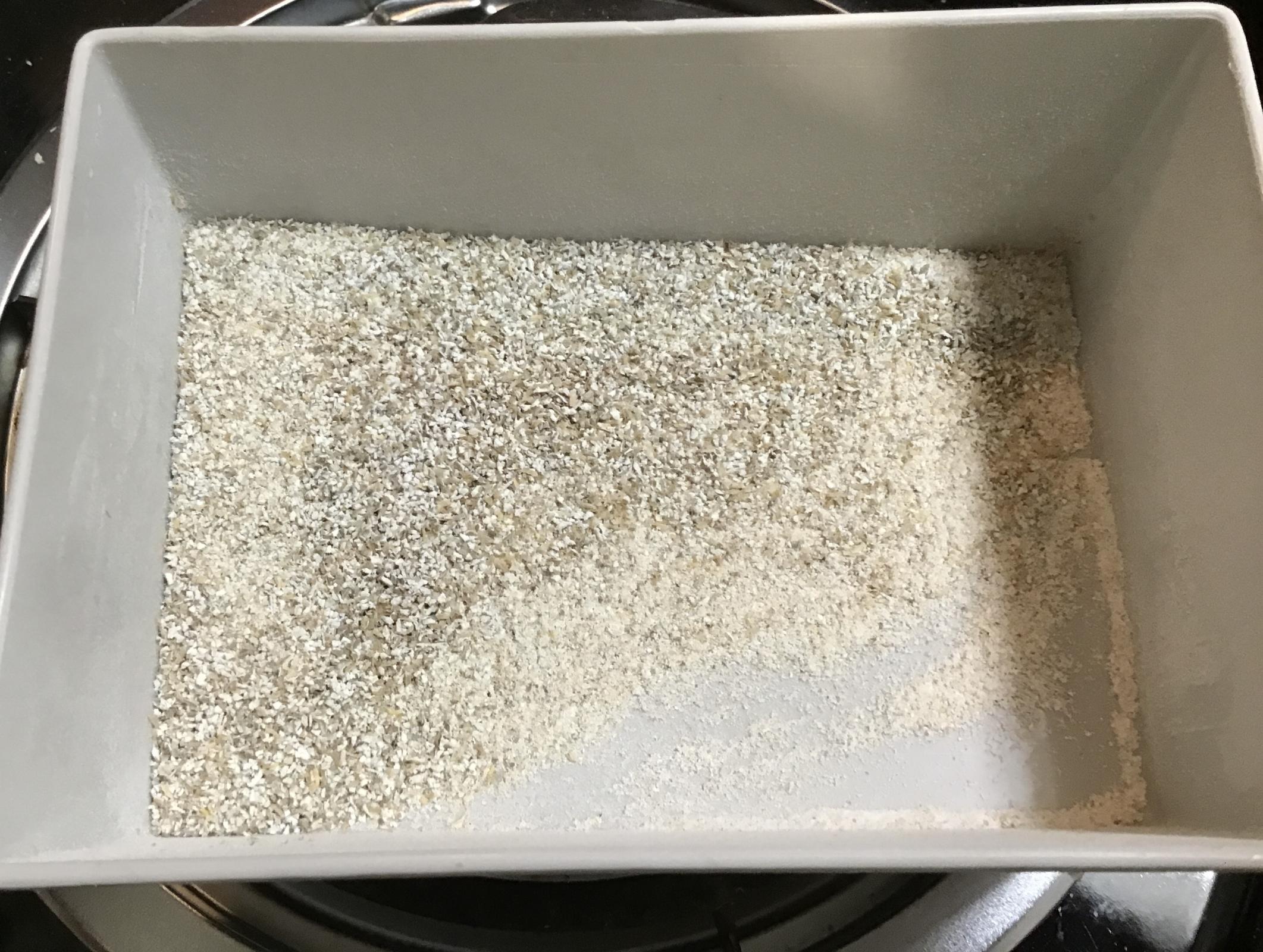 Here's the output of the 3-roller mill in a bag. I think I used setting "1." (Don't hold me to that. I won't be able to verify until the next time I mill, as I might have changed the setting when I cleaned it.) The fines and smaller particles settle to the bottom: