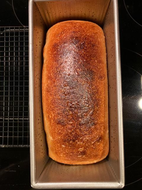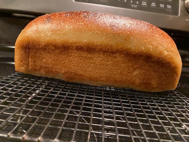 The lighter shade on the entire bottom of the loaf, basically a blonde color seems somewhat "typical"for a white bread in a loaf pan, maybe not. Removing the loaf from the pan and placing directly on the baking deck at the "half-way" mark should remedy that. It also should cut down the entire bake time, which I was surprised was so long - total of 38 minutes, the last 15 tented.