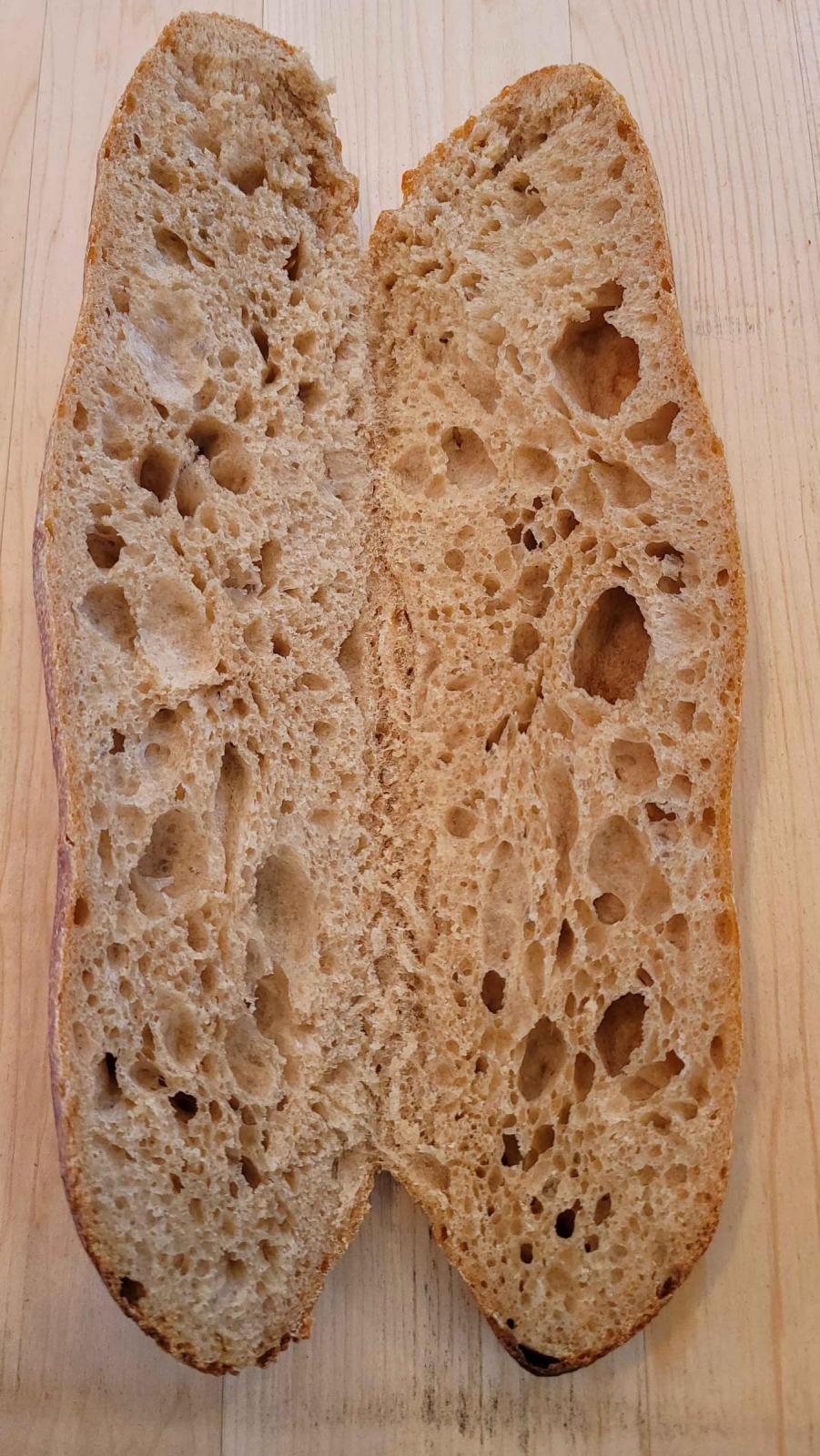 I like the look of the crust and crumb. The flour combination should give it a nice flavour. I found that when I add a small amount of sourdough to my 100% whole-wheat sandwich loaf. it enhanced the flavour.